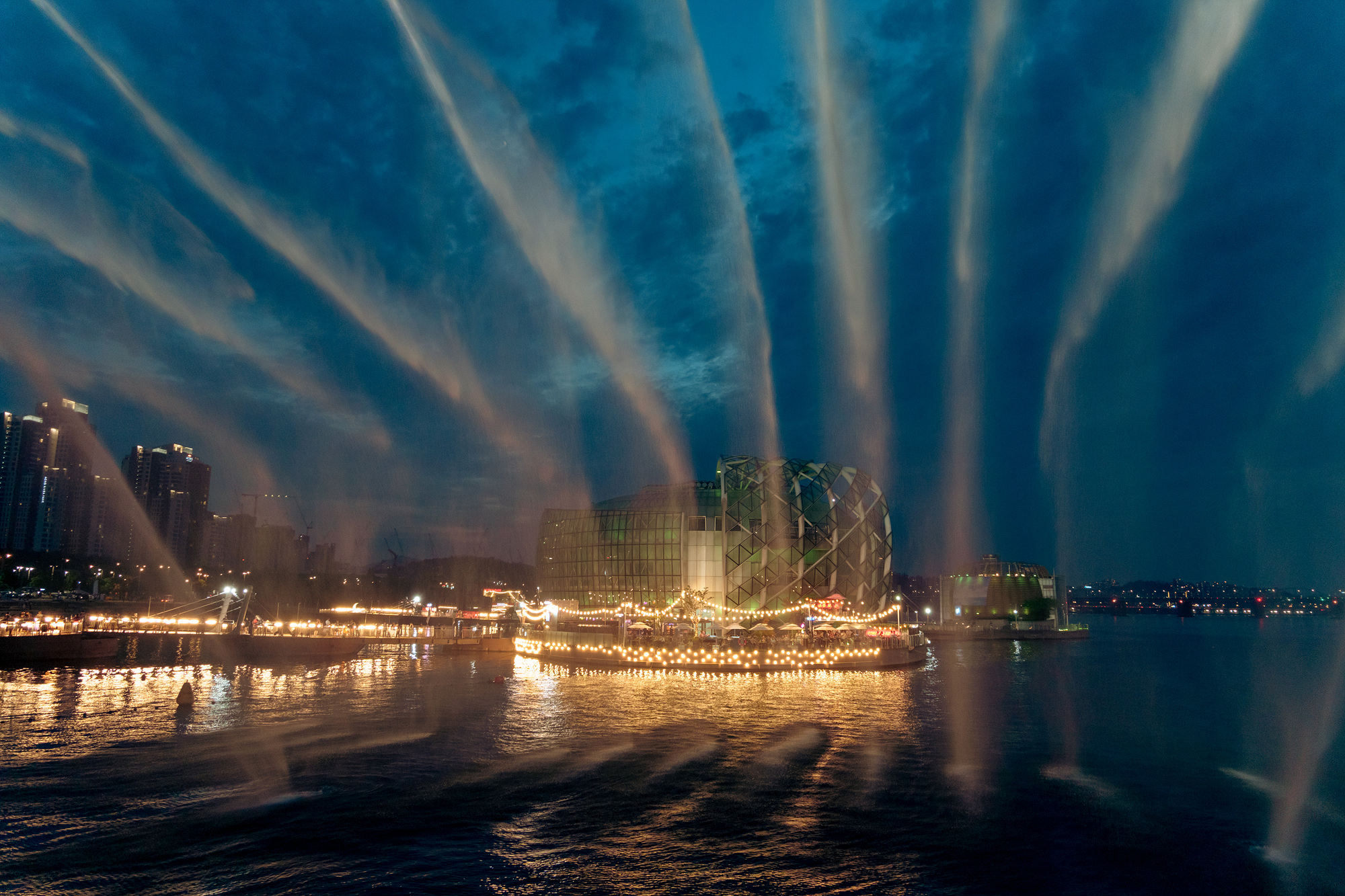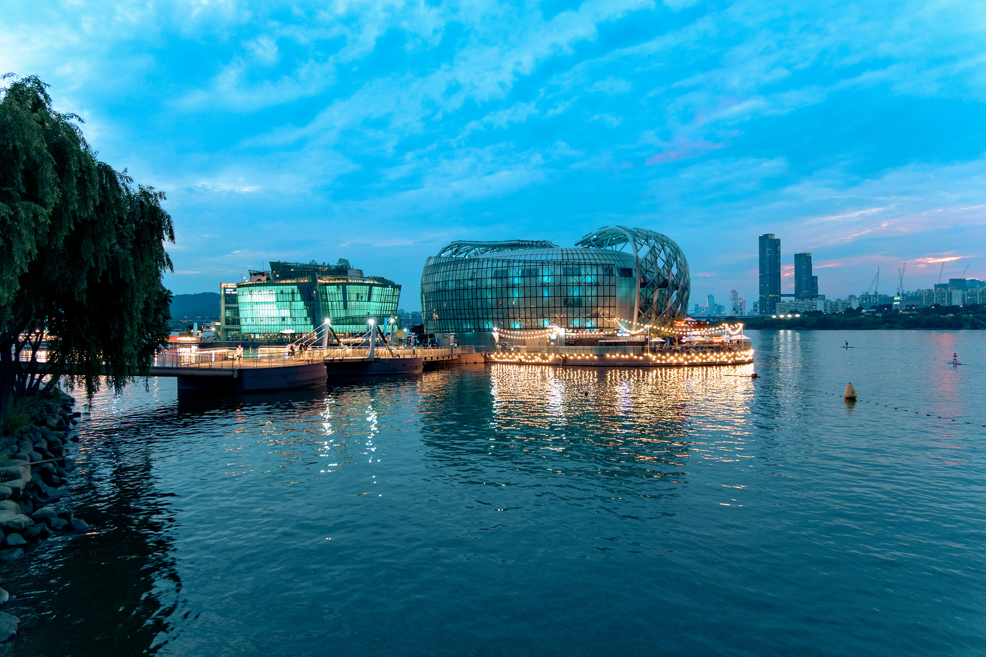 저녁이 되니 세빛섬에 불이 들어옵니다. 노을과 함께 촬영하면 무척 예쁜 곳인데 아쉽게 이날은 하늘이 많이 흐렸습니다.