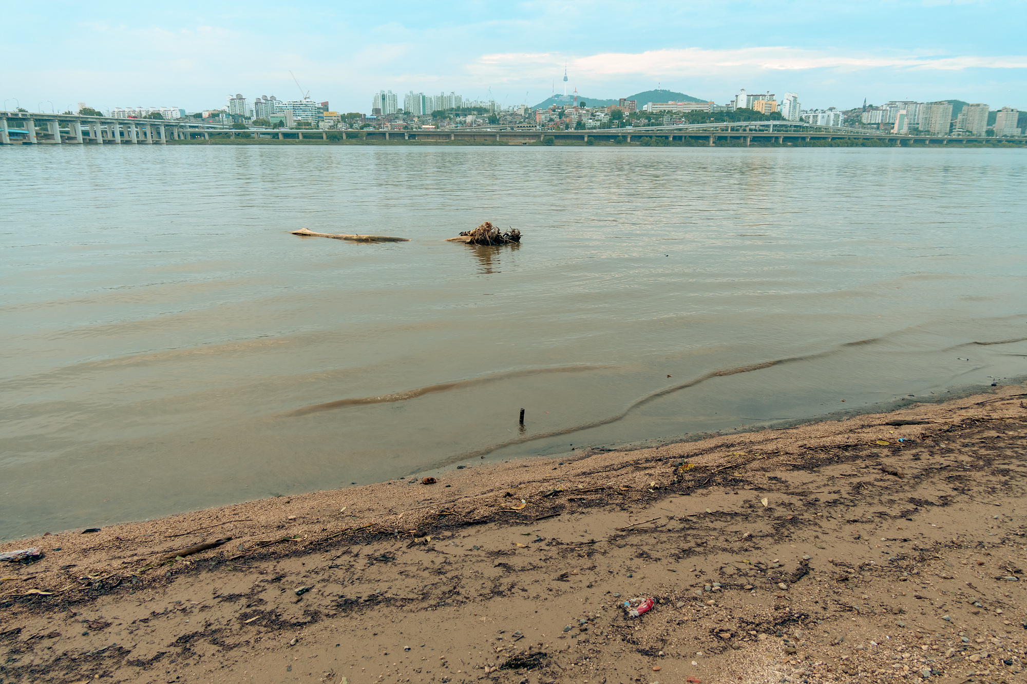 그 스폿에서는 이런 사진을 찍을 수 있습니다. 한강이지만 백사장 같은 묘한 느낌입니다.