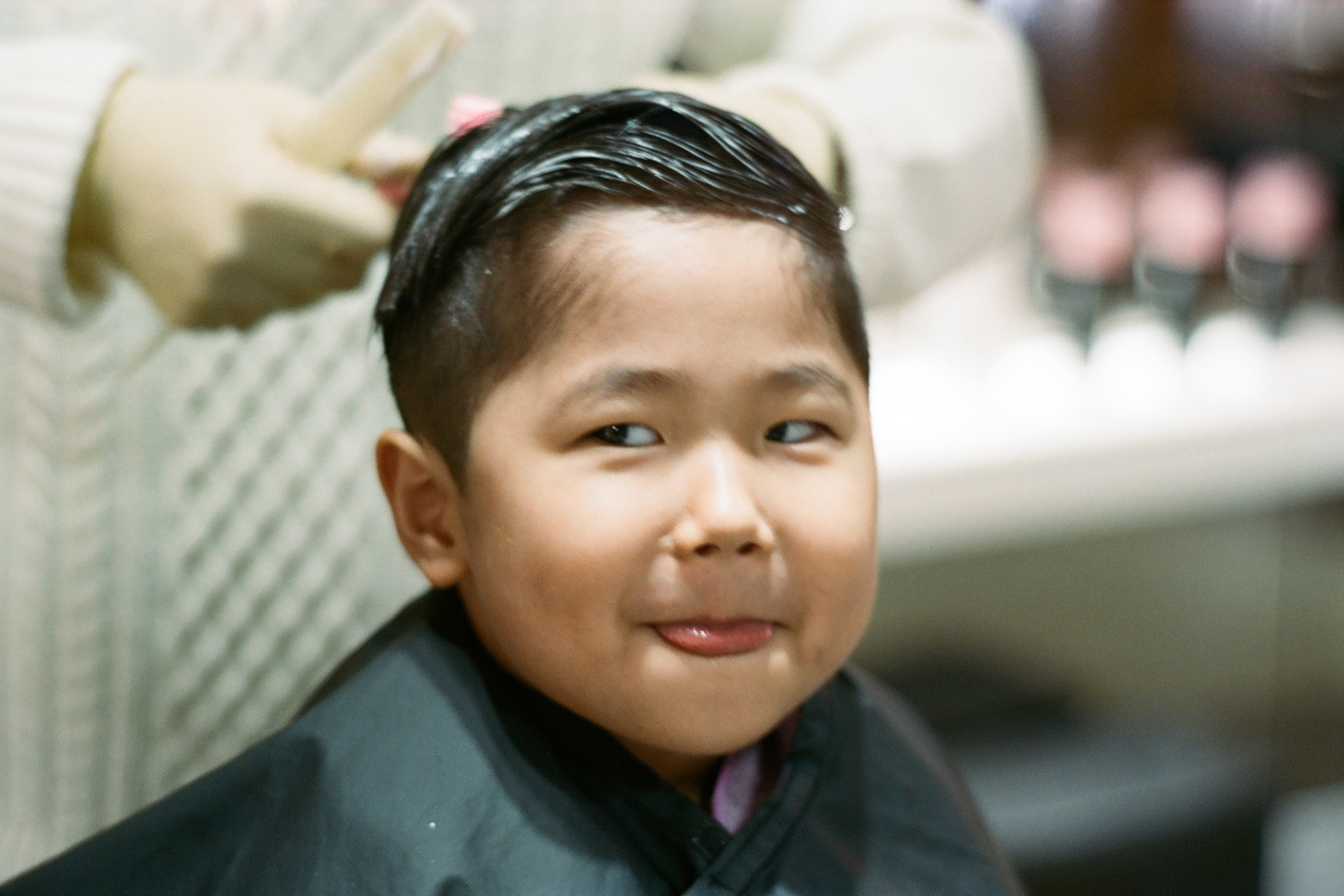 난생처음으로 파마에 도전하는 아들의 익살스런표정