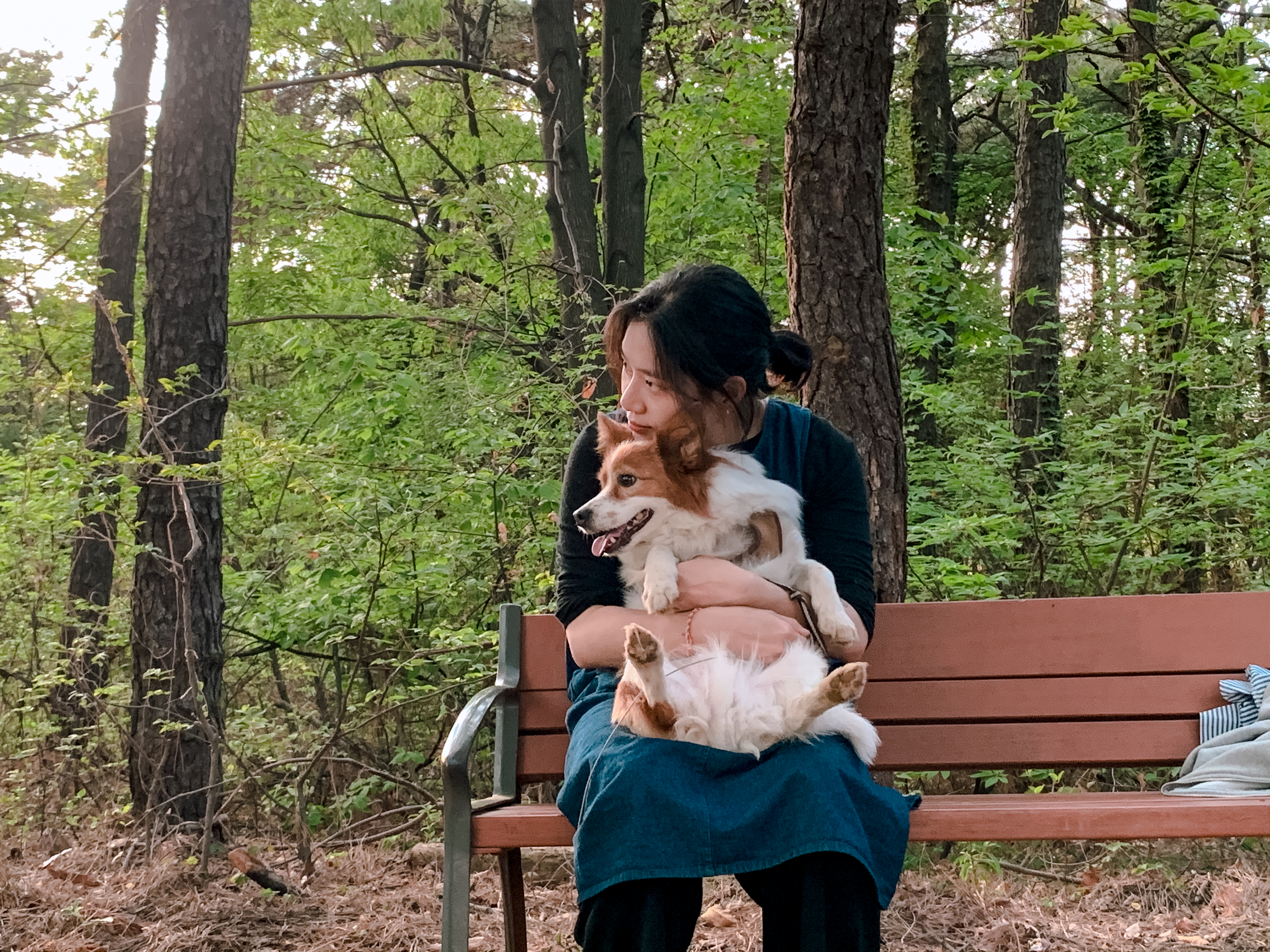 등산로에 있는 벤치에서 반려견과 같은곳을 바라보며