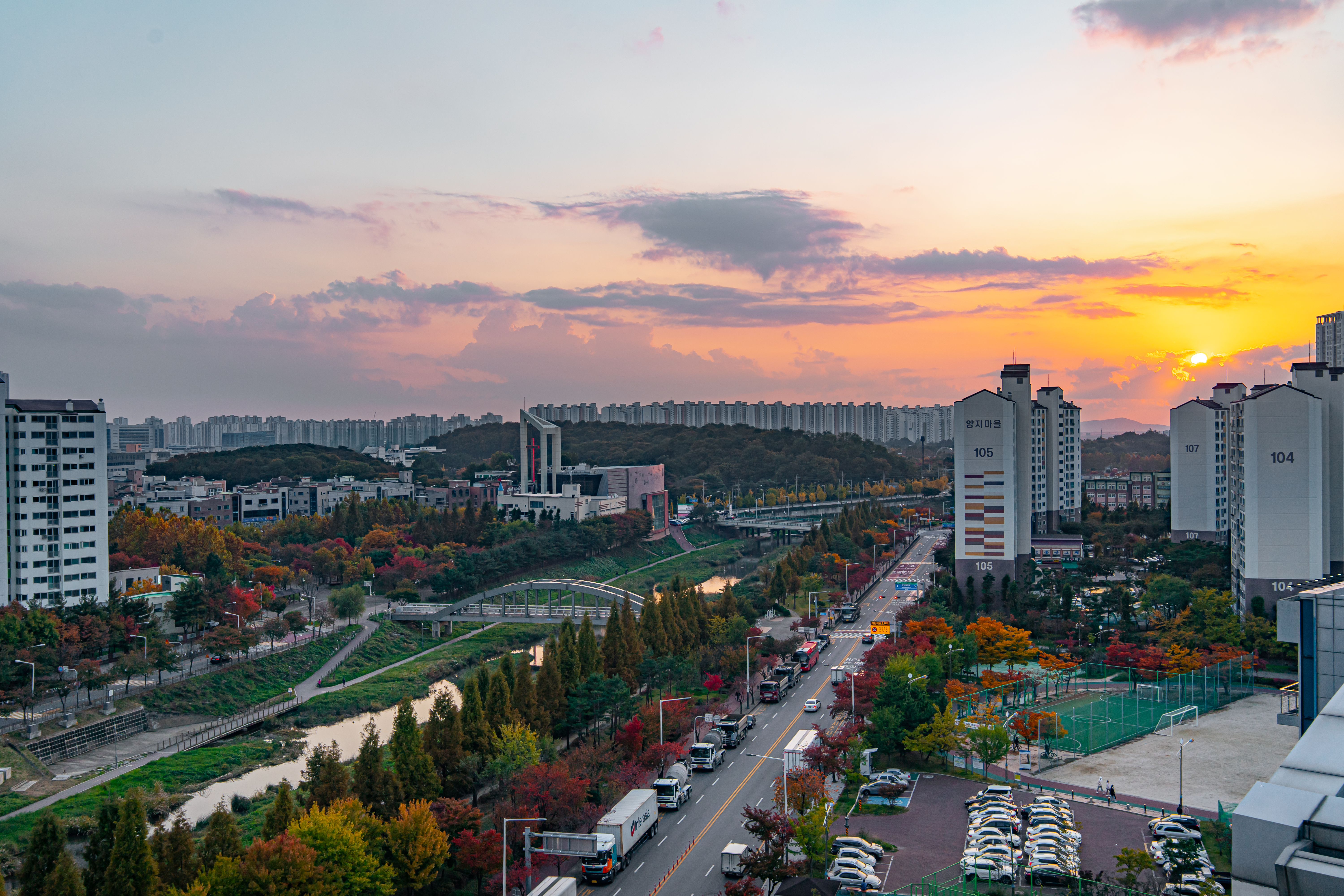 노을이 지는 가을의 안산천의 모습입니다.