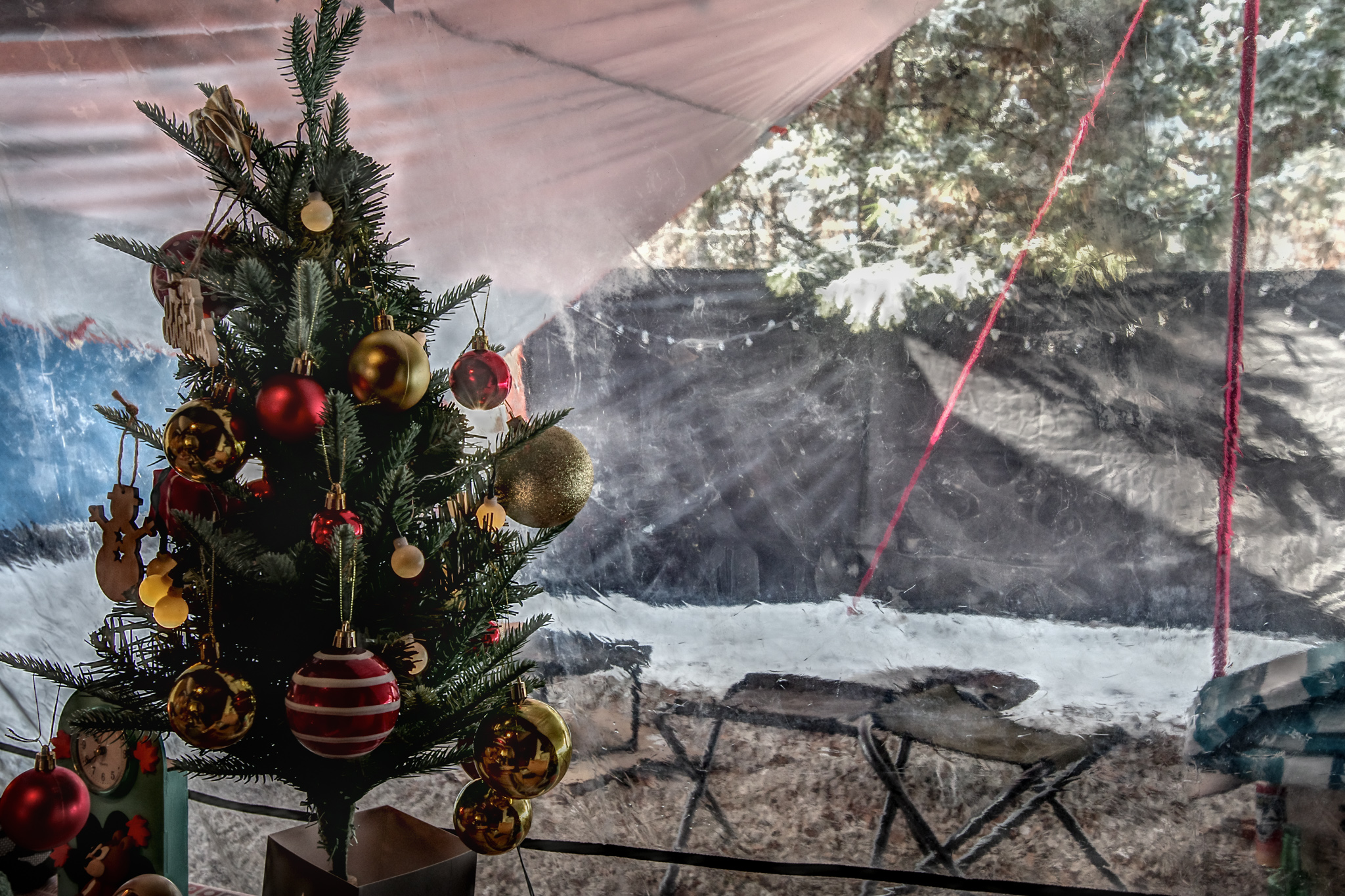 장박지에서 크리스마스를 위해 준비한 트리와 눈 내린 설경을 배경으로 찍었습니다.