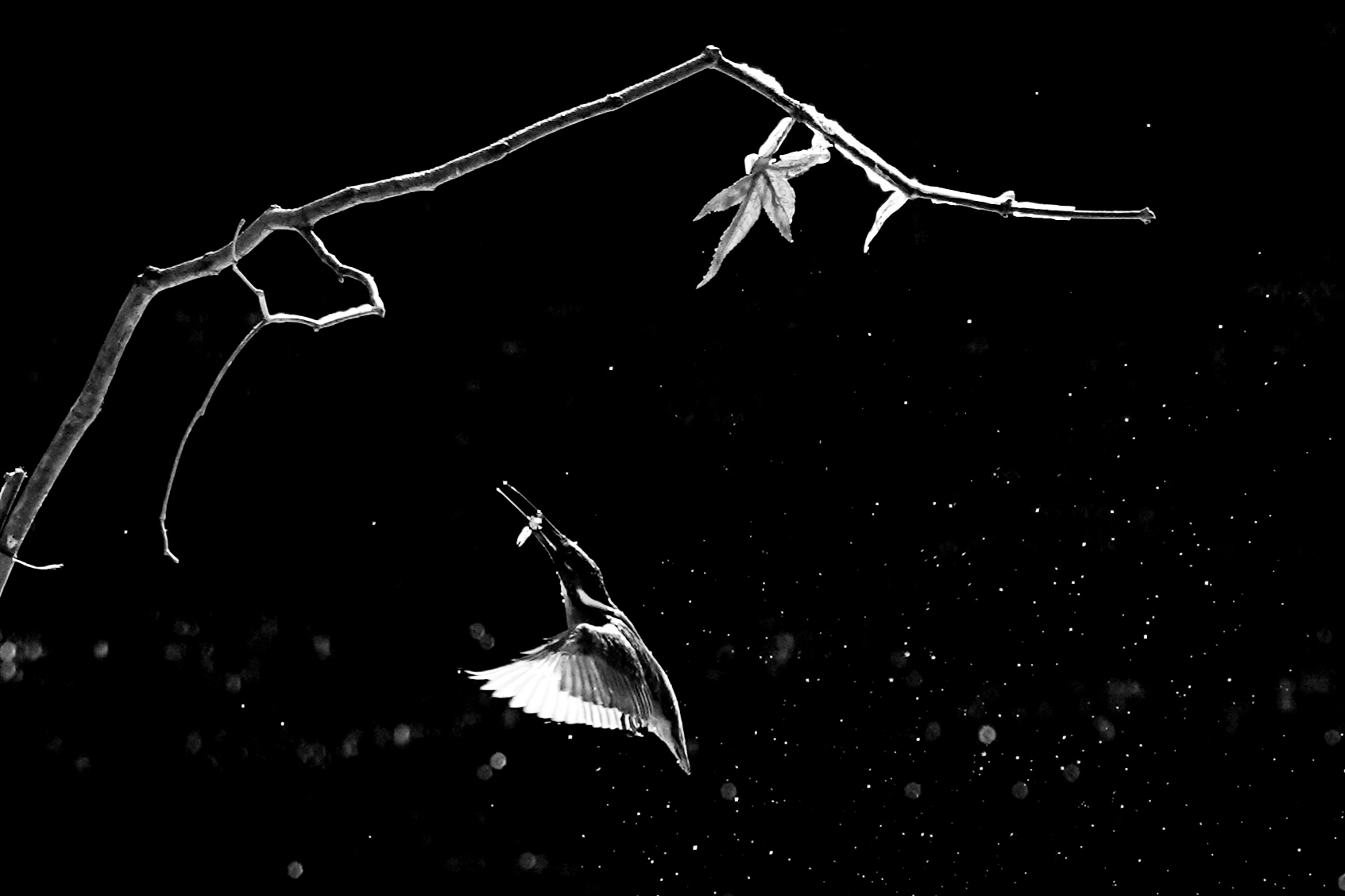 물총새가 먹이를 물고 날아오르는 장면입니다.