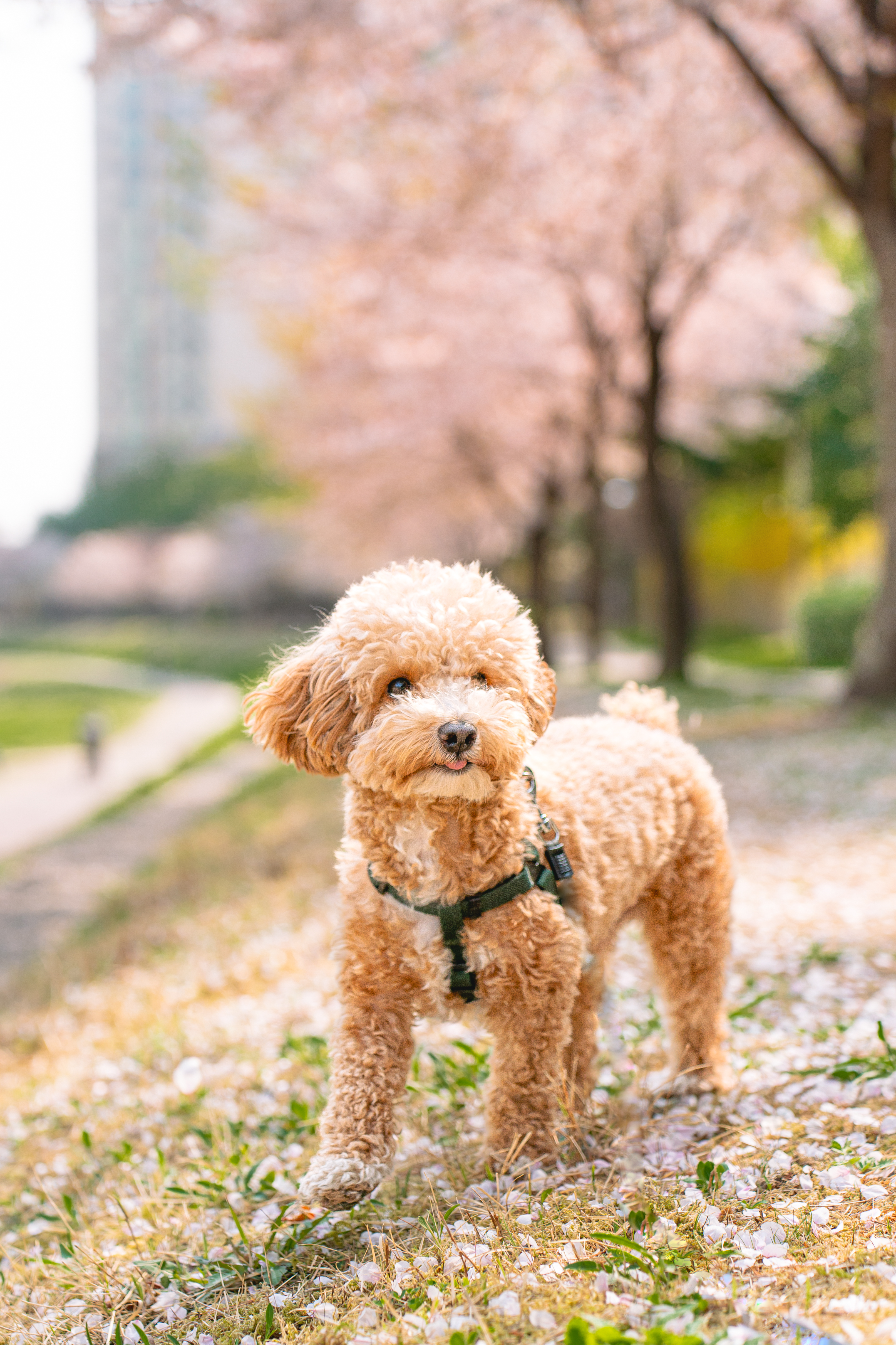 반려견과 자주가는 하천산책로에 벚꽃보러 갔습니다. 혀를 빼꼼 내민 저희 리무 (반려견 이름) 이쁘죠?