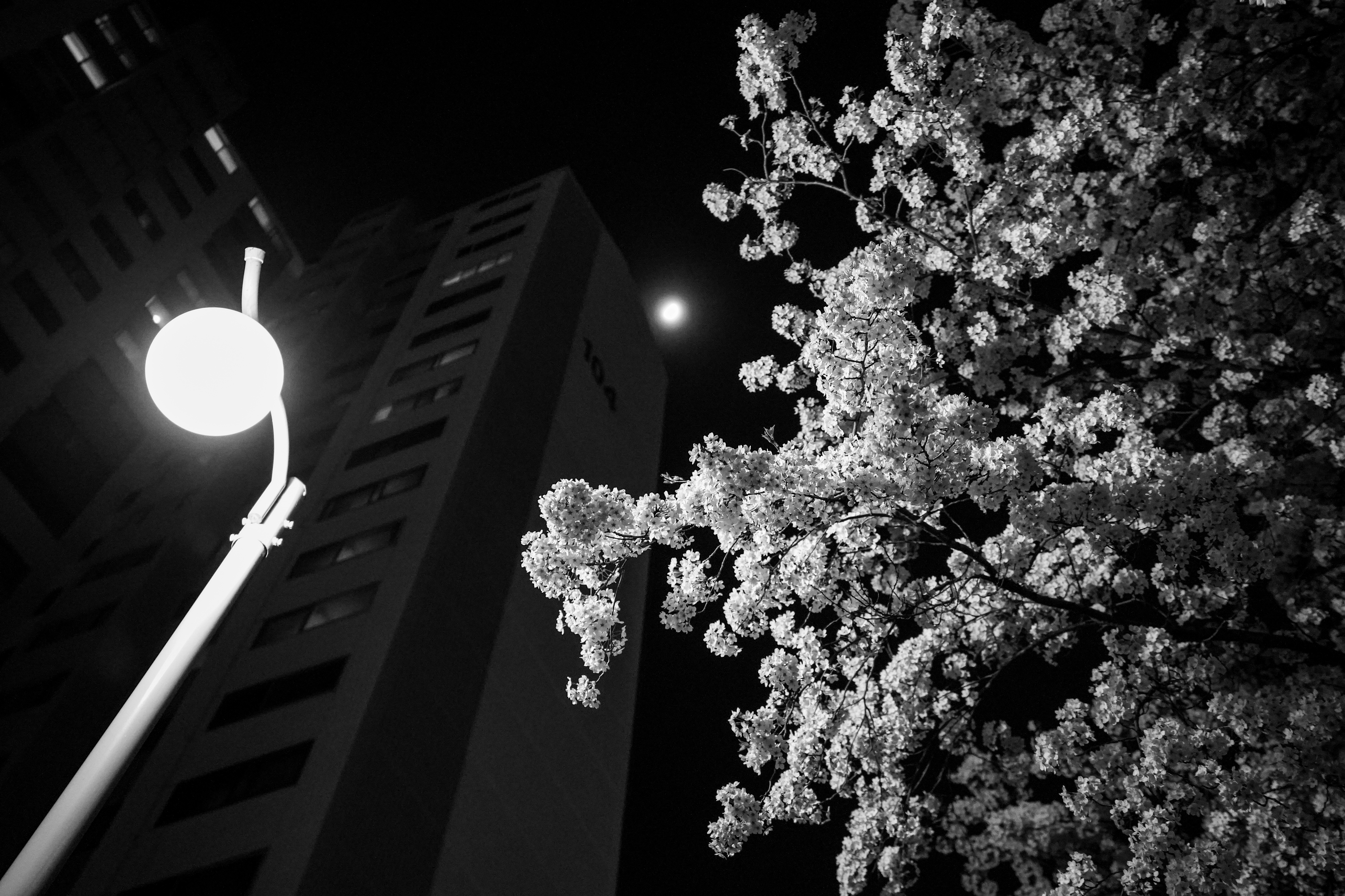 벚꽃이 가로등 빛을 받아서 밤에도 화려하게 빛난다.