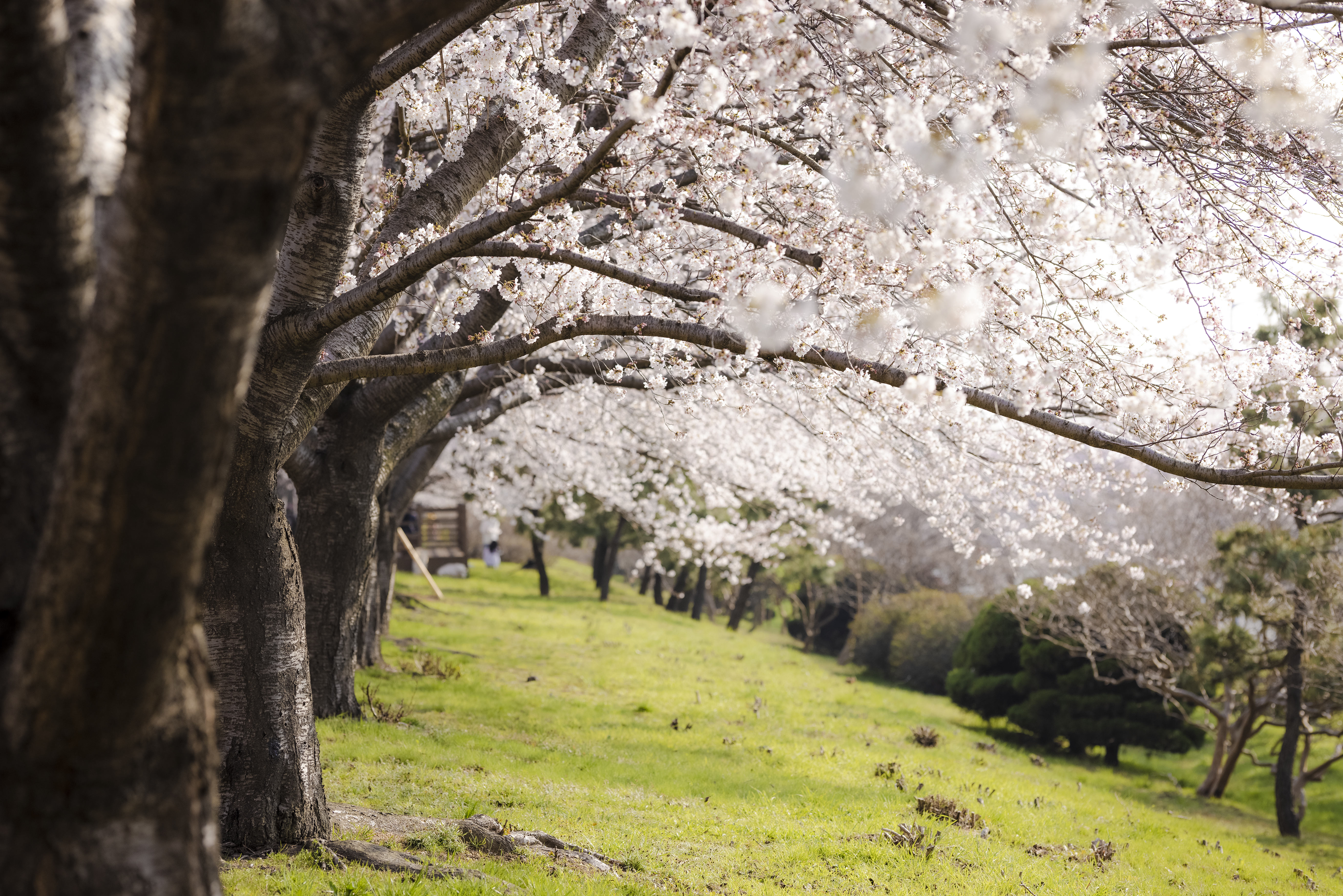 푸릇푸릇한 들판과 힘차게 뻗어나간 나뭇가지위로 예쁘게 핀 벚꽃들
