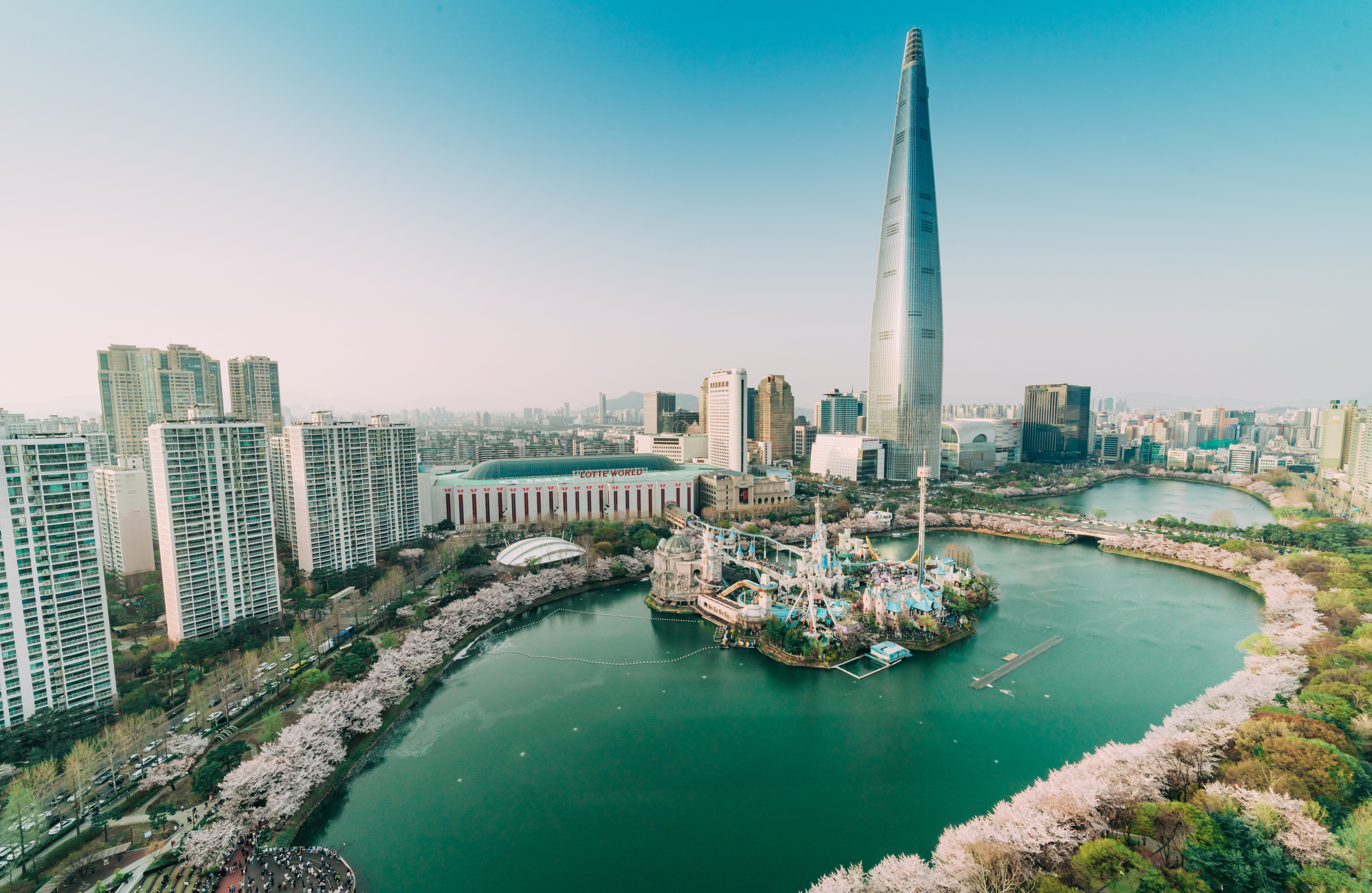 푸른하늘과 빛나는 롯데월드타워 그리고 분홍색 벚꽃들이 어우러져 봄을 알리고 있습니다.