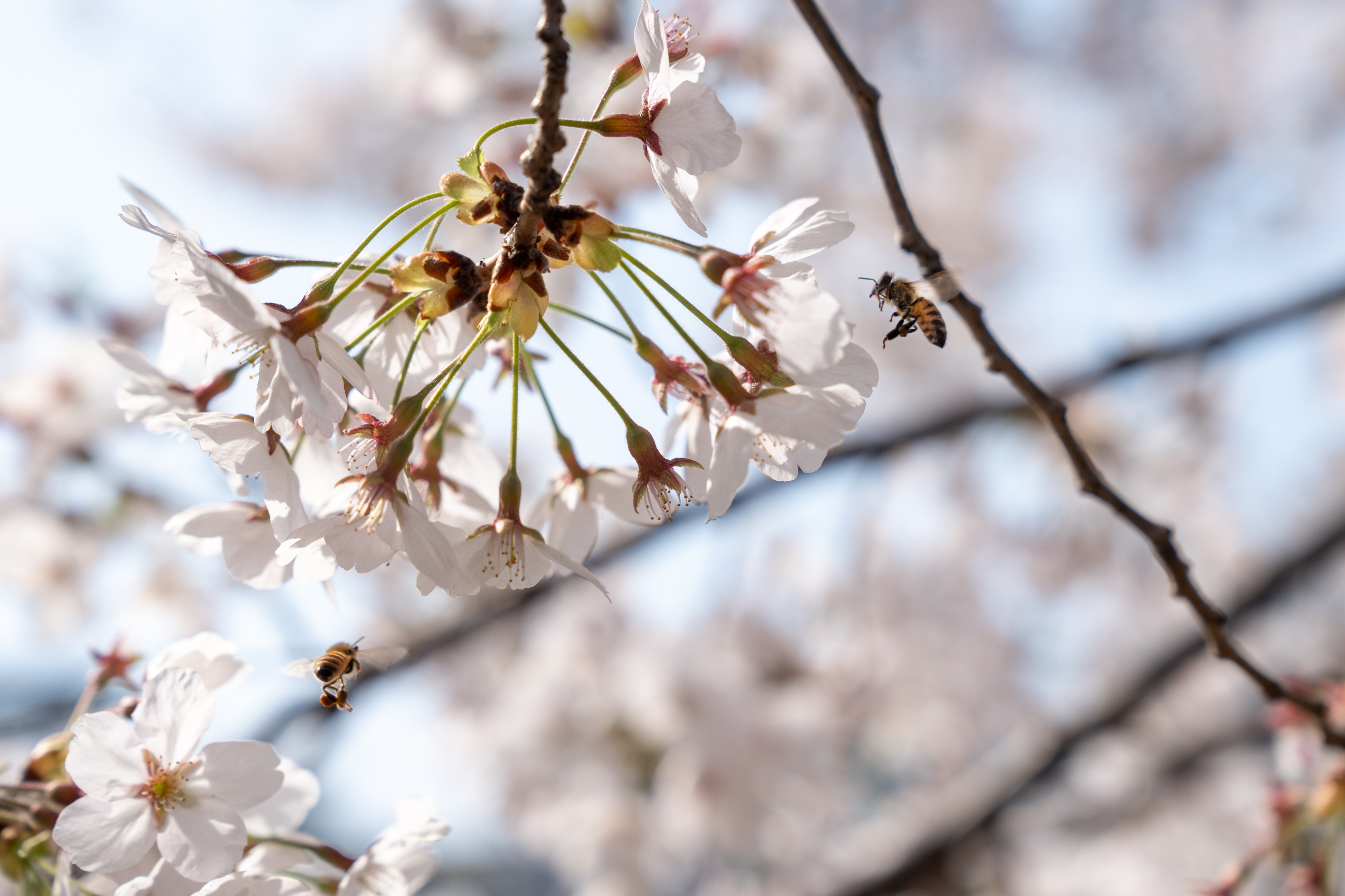 벚꽃이 만개했고 벌들이 협력해 부지런히 일을하고 있었다