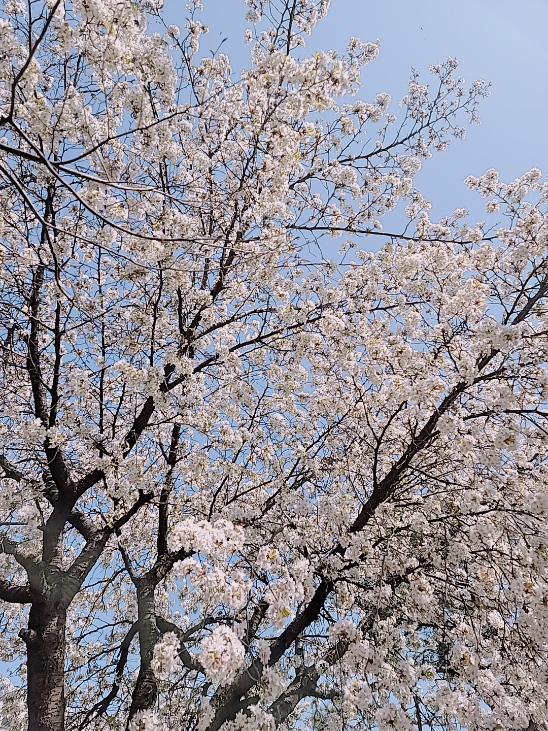 키가 큰 벚꽃나무를 올려다보며 신장 차이를 느끼는 상황