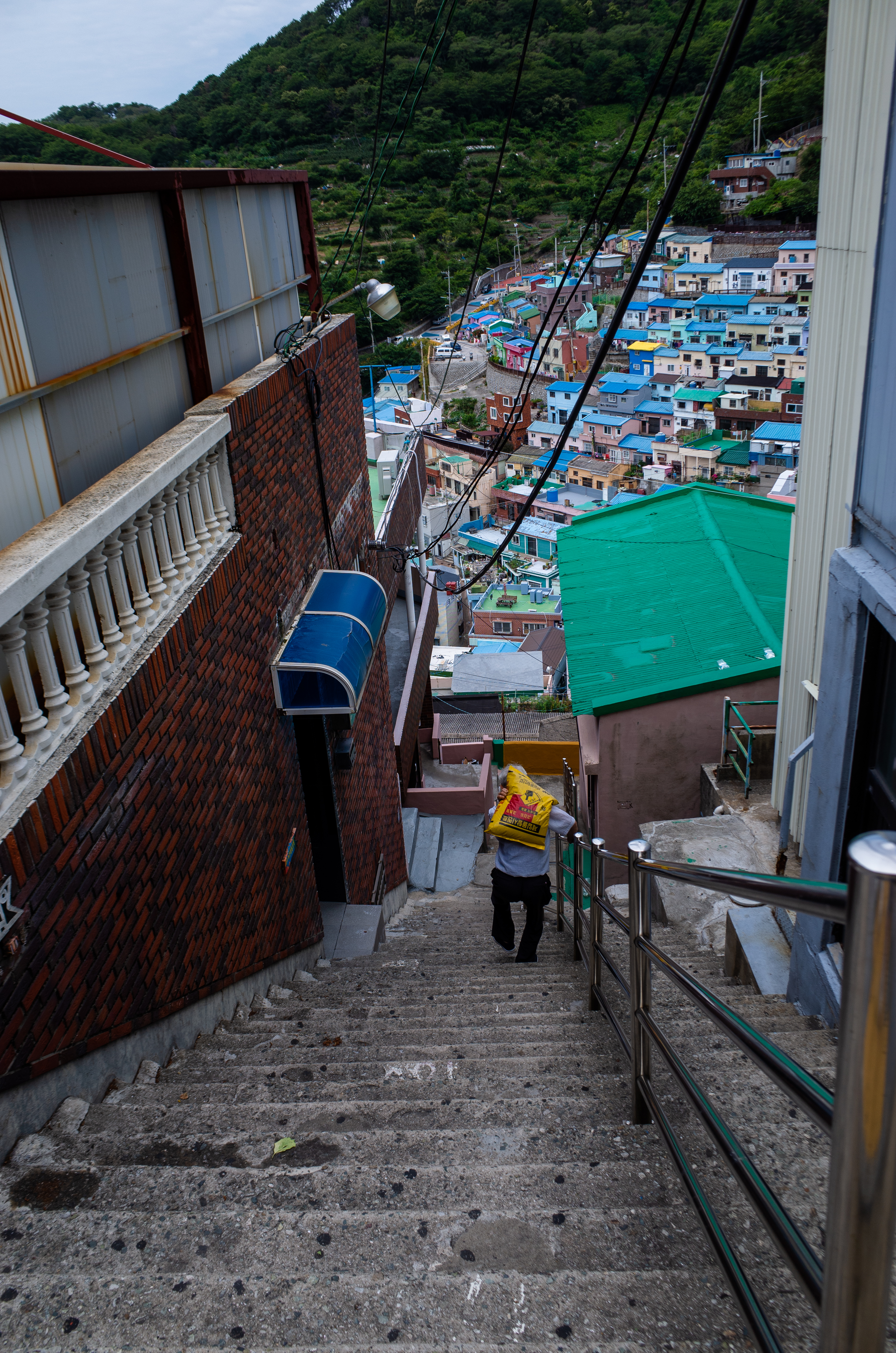 감천 문화마을을 걷던중 할아버지께서 힘겹게 시멘트 1포대를 들고 내려가시는 모습을 담았습니다. 힘겨워 보였지만, 또 그만의 삶의 애환이 담겨 있는거 같습니다.