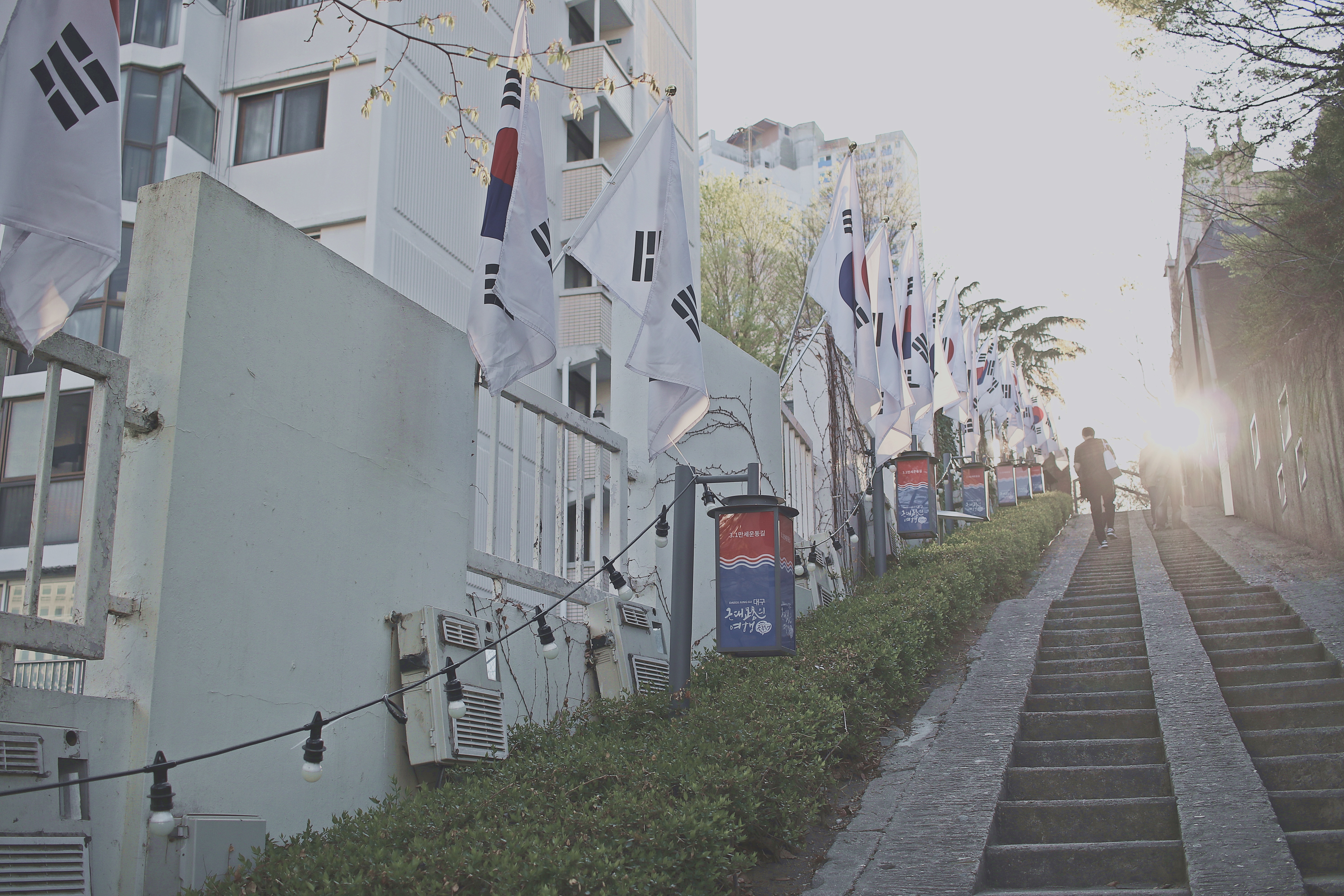 대구 청라언덕의 옛길과 건물, 그리고 3.1운동을 연상케 하는 태극기. 그리고 이를 비춰주는 태양.