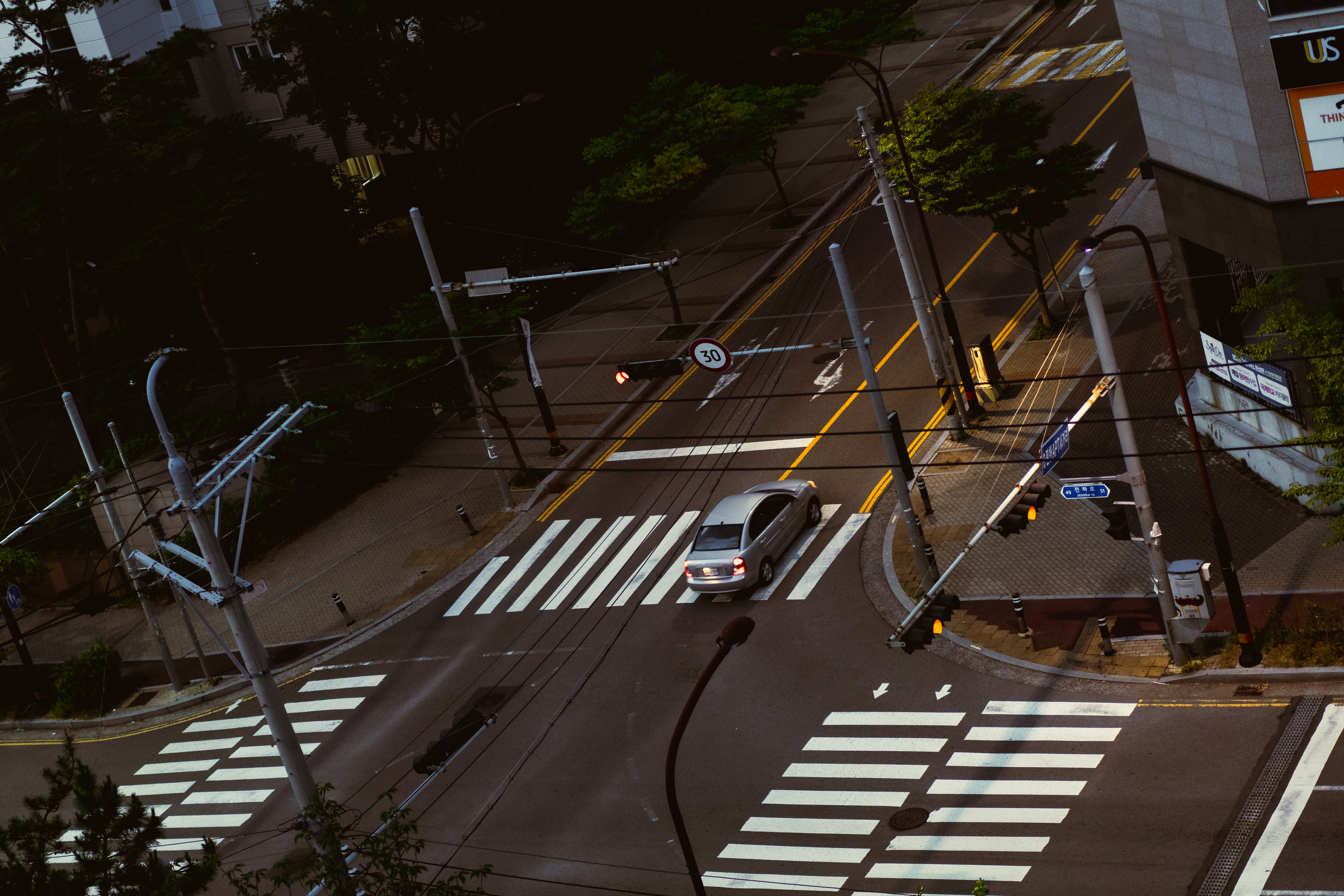 이른 새벽 고요하고 텅 빈 거리. 바삐 지나가는 차 한대.