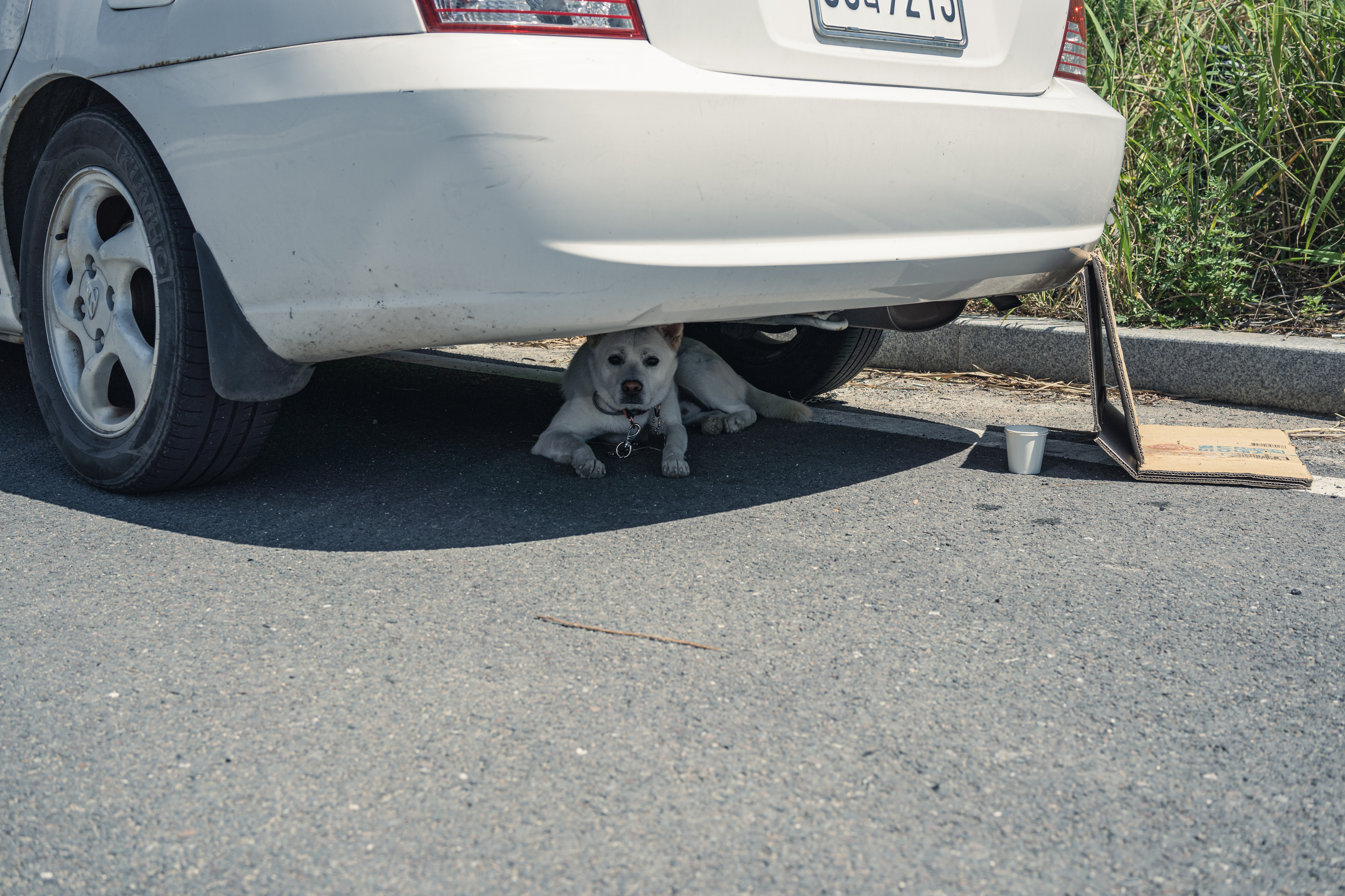 초여름 더위를 피해 그늘에 숨어있는 강아지와의 눈맞춤