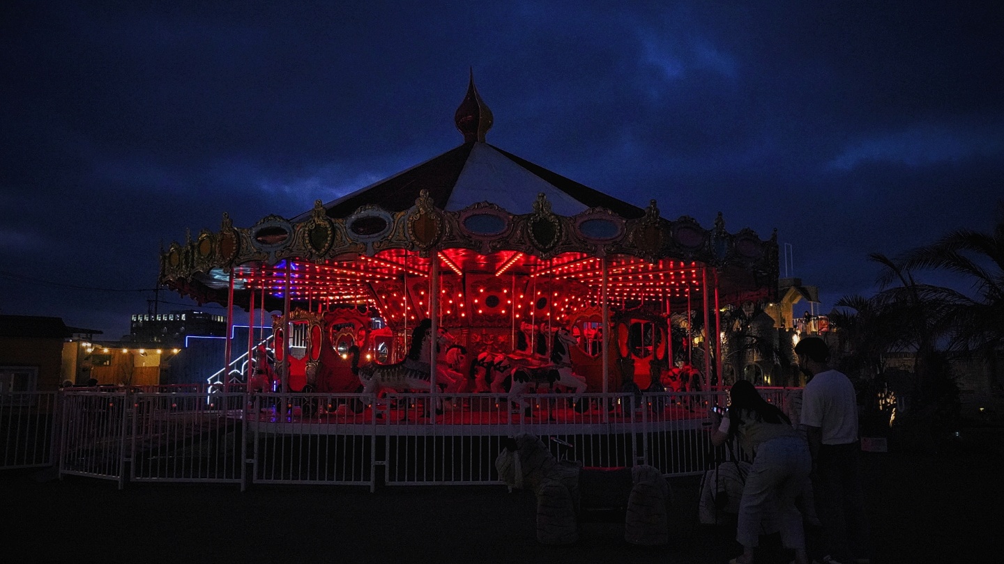 제주에서 하루는 어두워지고 산책후 작은 놀이공원을 지나가는 길.. 캄캄한 저녁에 대비되는 붉은 조명에 멋들어진 회전목마를 보았습니다. 그 순간을 담으려는 사람과 또 그것을 담으려는 저.. 퇴사후 외롭게 혼자 제주로 잠시 여행을 와서 그 인상적인 풍경은 저에게 너무 특별하고 페스티벌한 순간이었습니다.