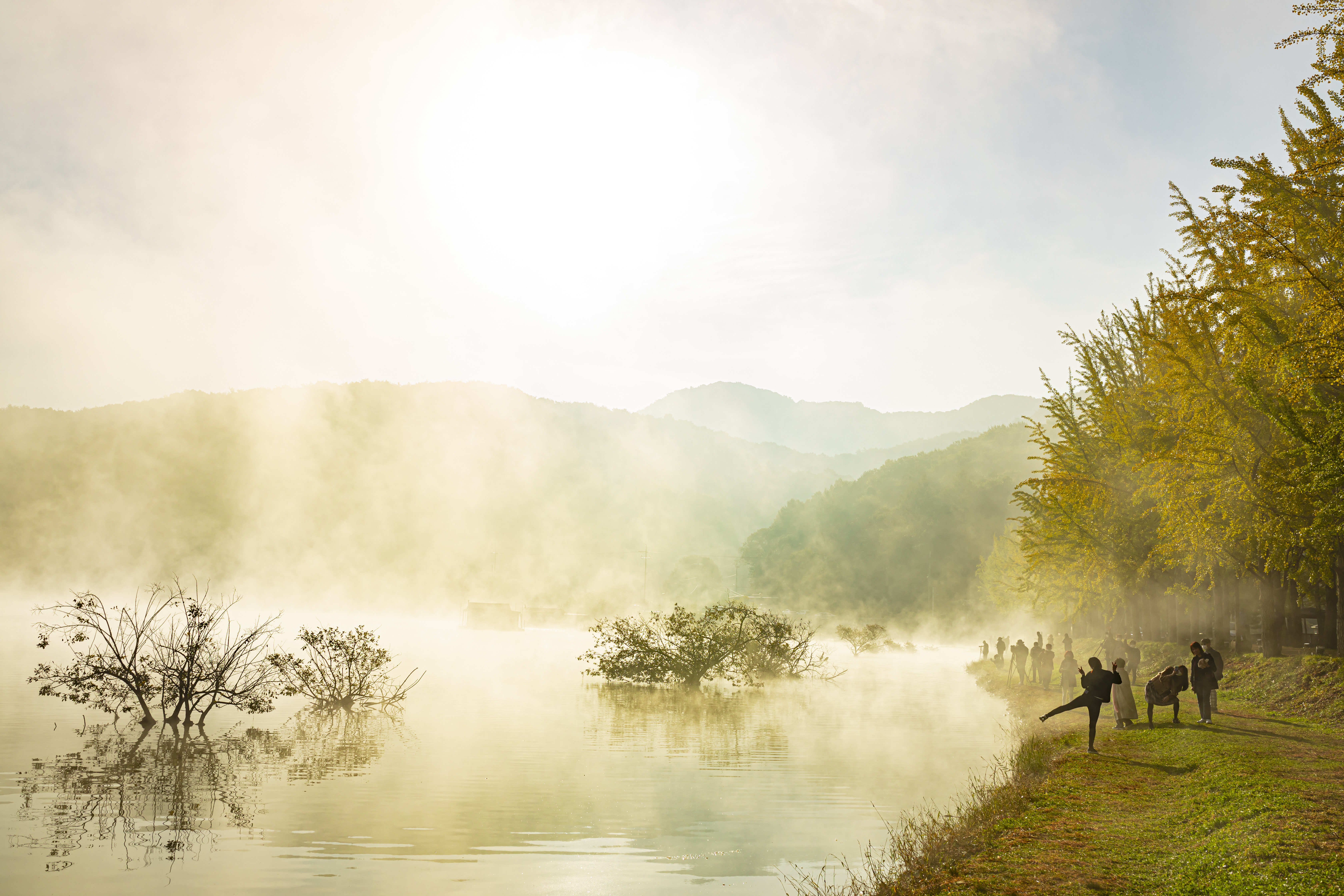 가을의 물안개와 은행나무를 즐기러 온 사람들의 풍경을 담았습니다.