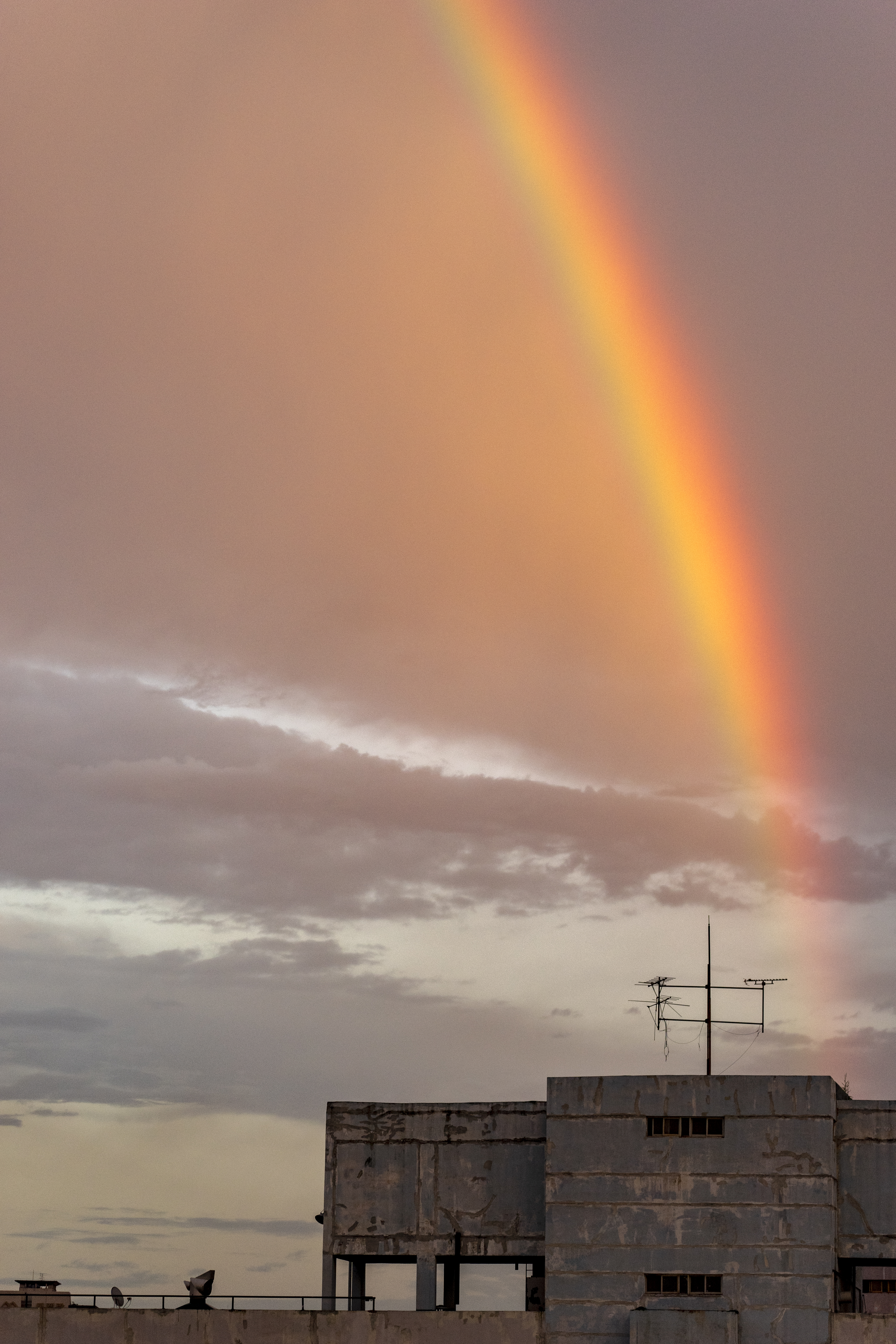 오래된 아파트와 아름다운 색깔의 무지개가 대조적이다.