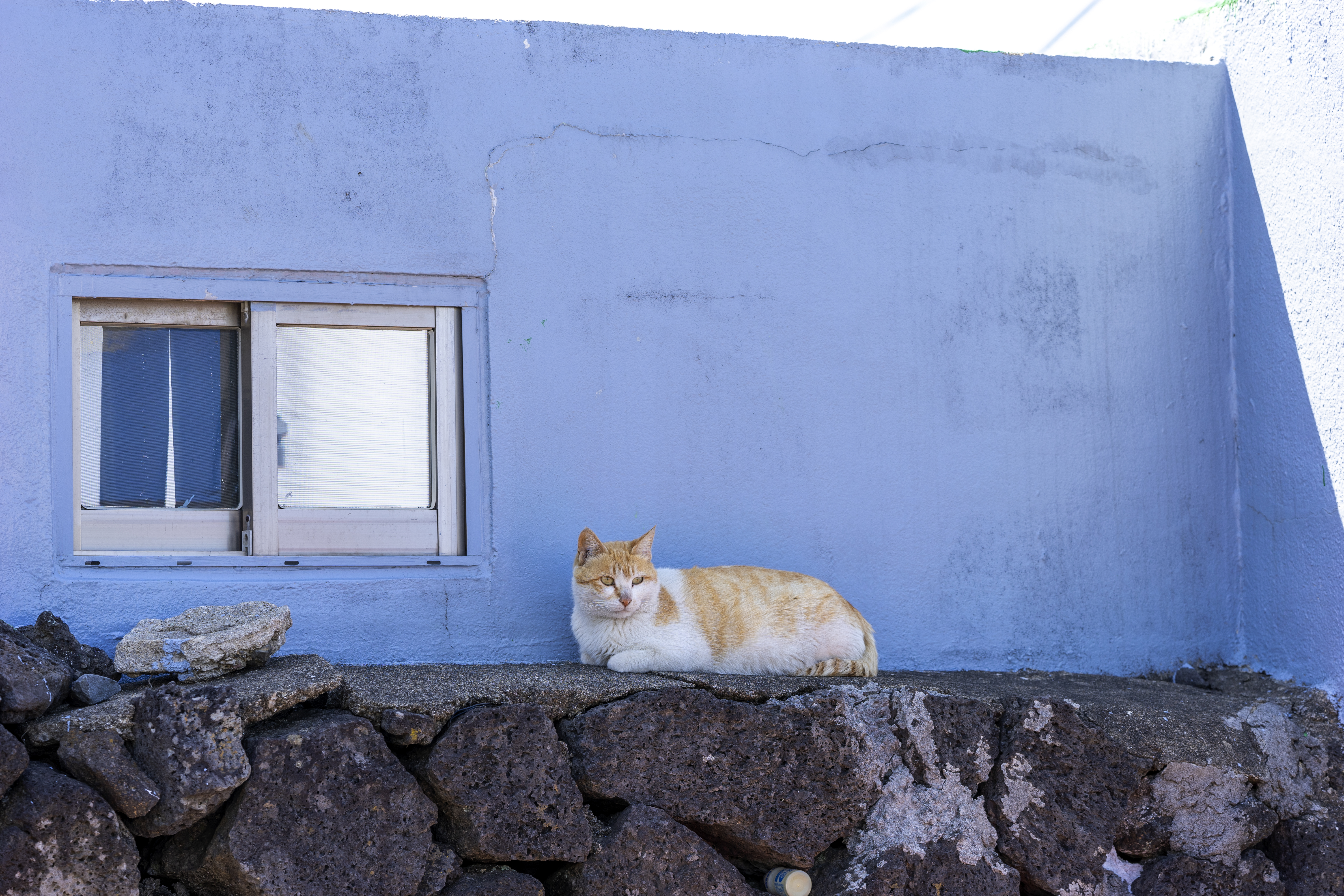 파란 하늘 빛같은 건물, 그 담 옆에서 휴식을 취하는 노란 고양이