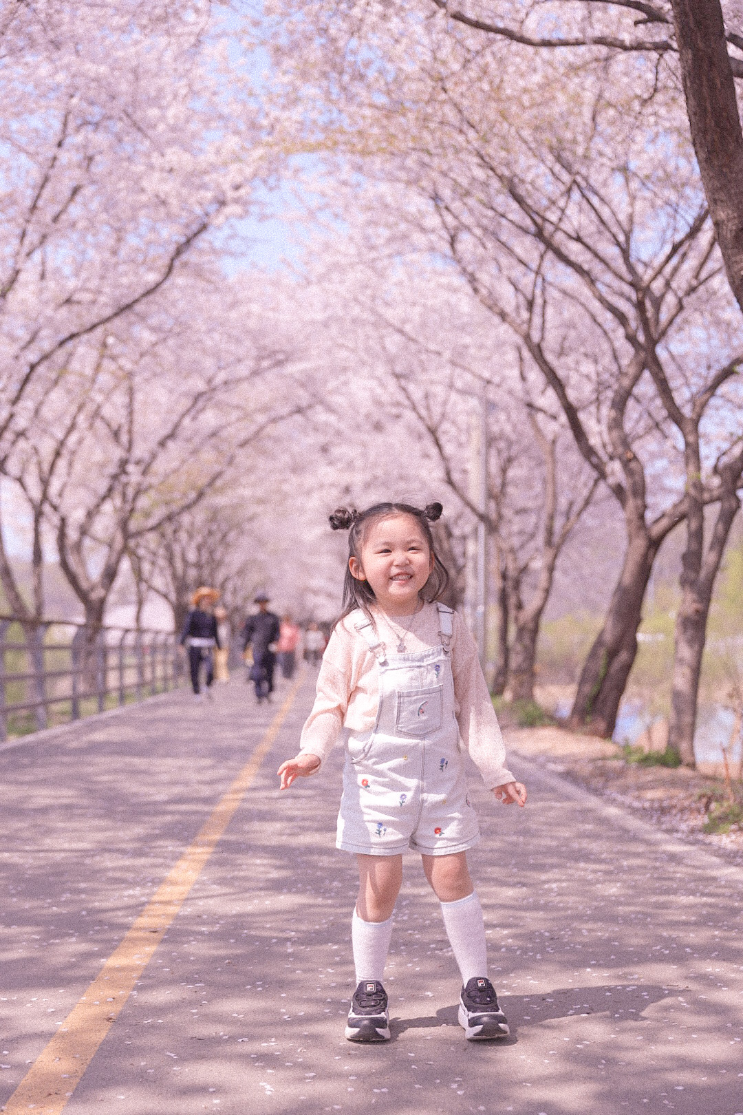 좋은날에 만개한 벚꽃을보며 좋아하는 딸
