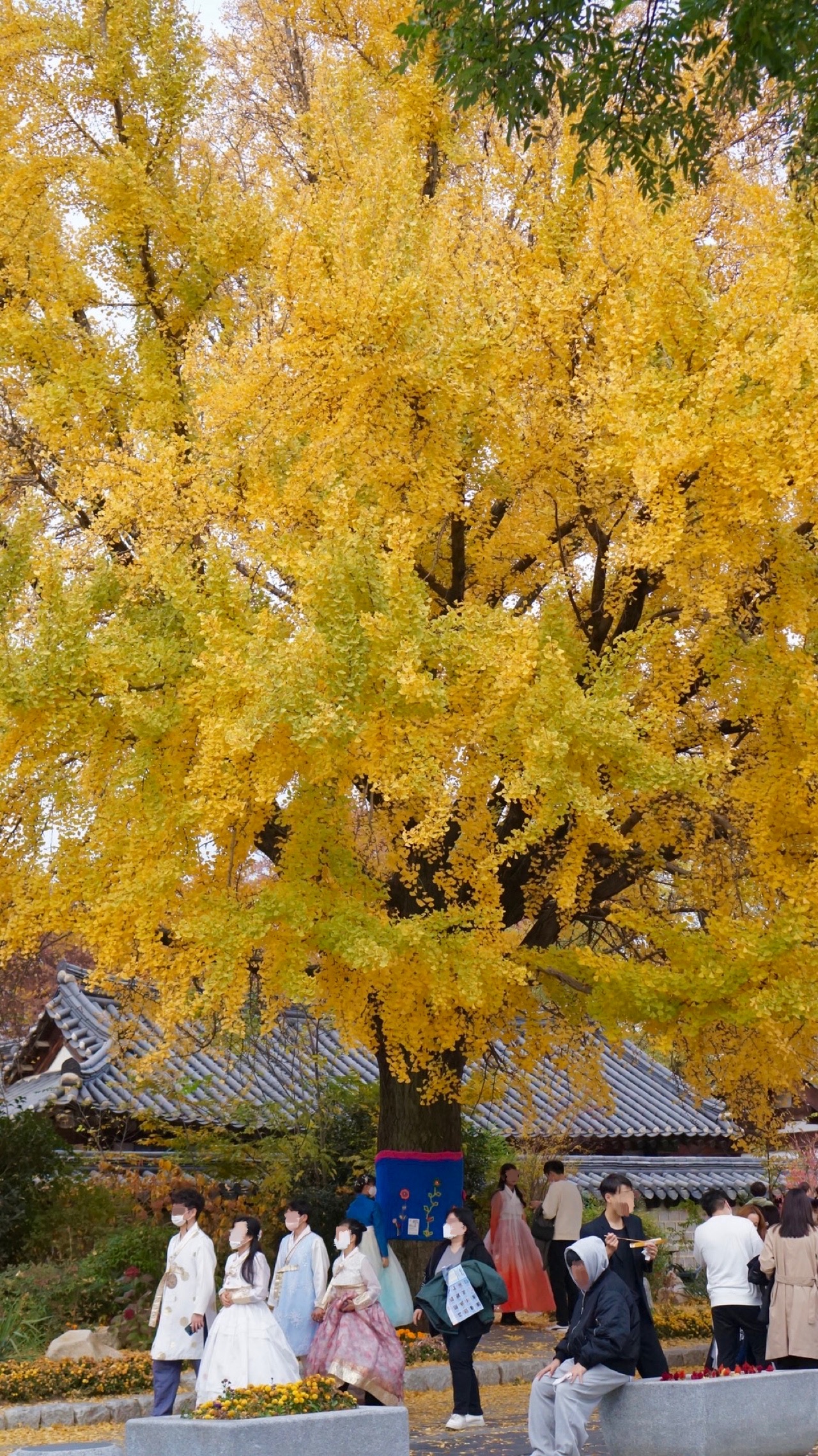 친구와 한옥마을을 걷는중 은행이 가득 핀 아주 큰 나무를 보았습니다. 그 밑에 아름다운 색의 한복을 입은 사람들이 있었고, 뒷 배경에는 기와가 보였습니다. 그 순간 사진, 드라마에서 봐 왔던 제가 상상하는 조선시대의 모습을 잠시 들여다본것 같았습니다. 알록달록한 한복, 가을의 색을 머금은 아주 큰 은행나무를 저는 잊을수가 없습니다. 그여행에서 제일 좋아하는 사진을 공유합니다.