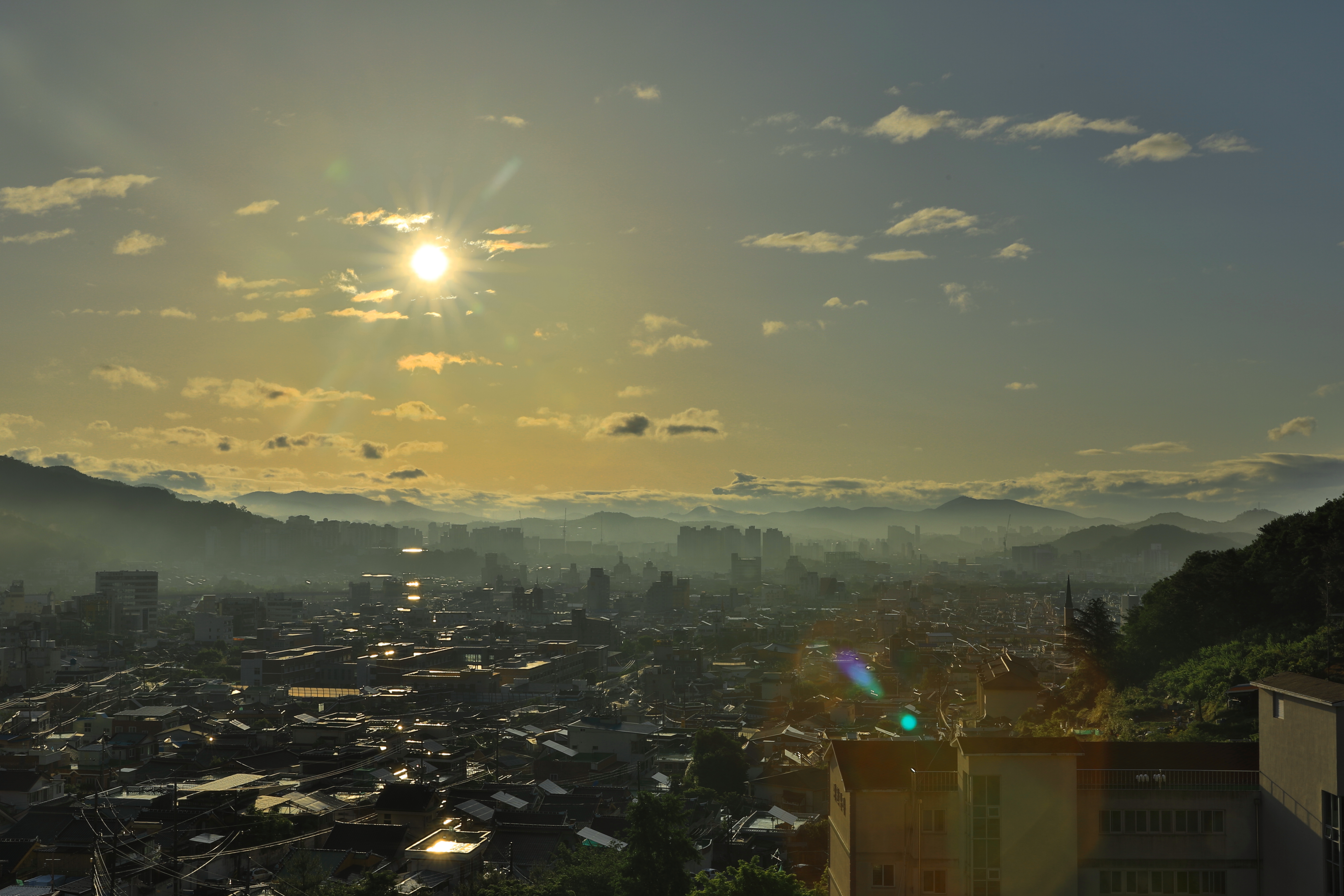 밤 늦게까지 비가 내리다 갠 다음날아침 살고있는 아파트 옥상에서 촬영함