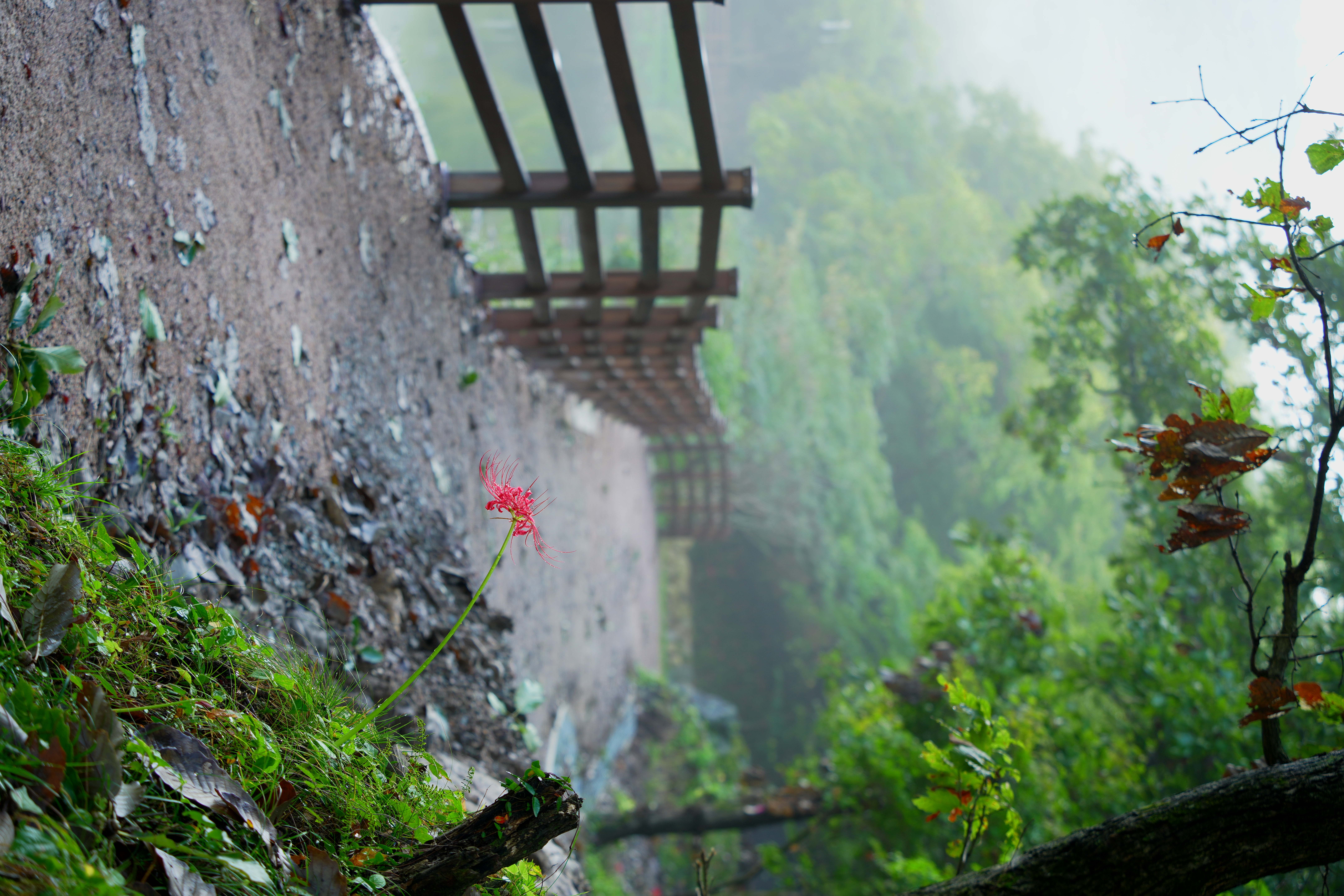 불갑사 호숫가에 핀 상사화(꽃무릇) 과 산책로