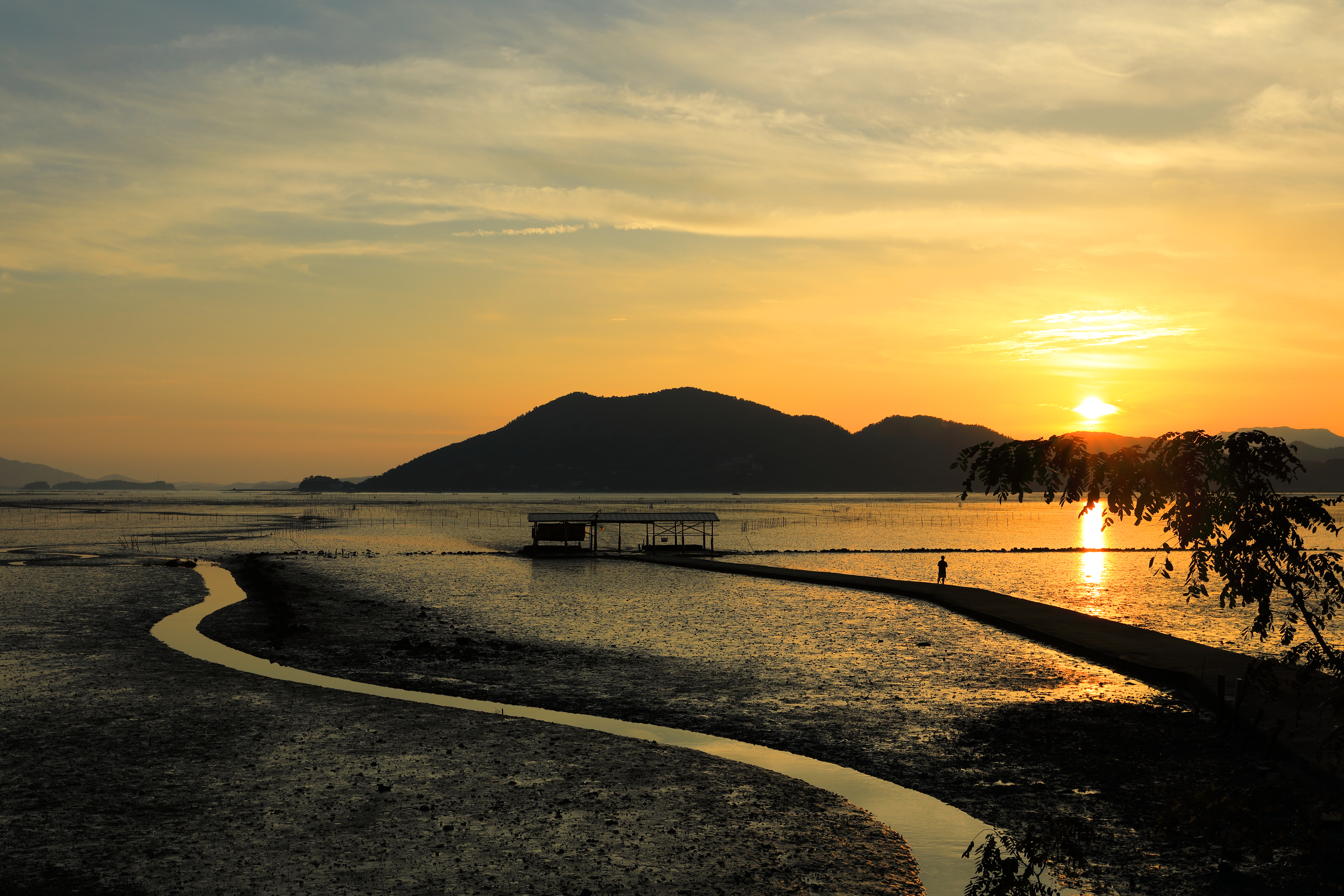일몰시간에 썰물로 드러나 갯골과 작업로에서 혼자 일몰광경을 즐기는 모습을 촬영함