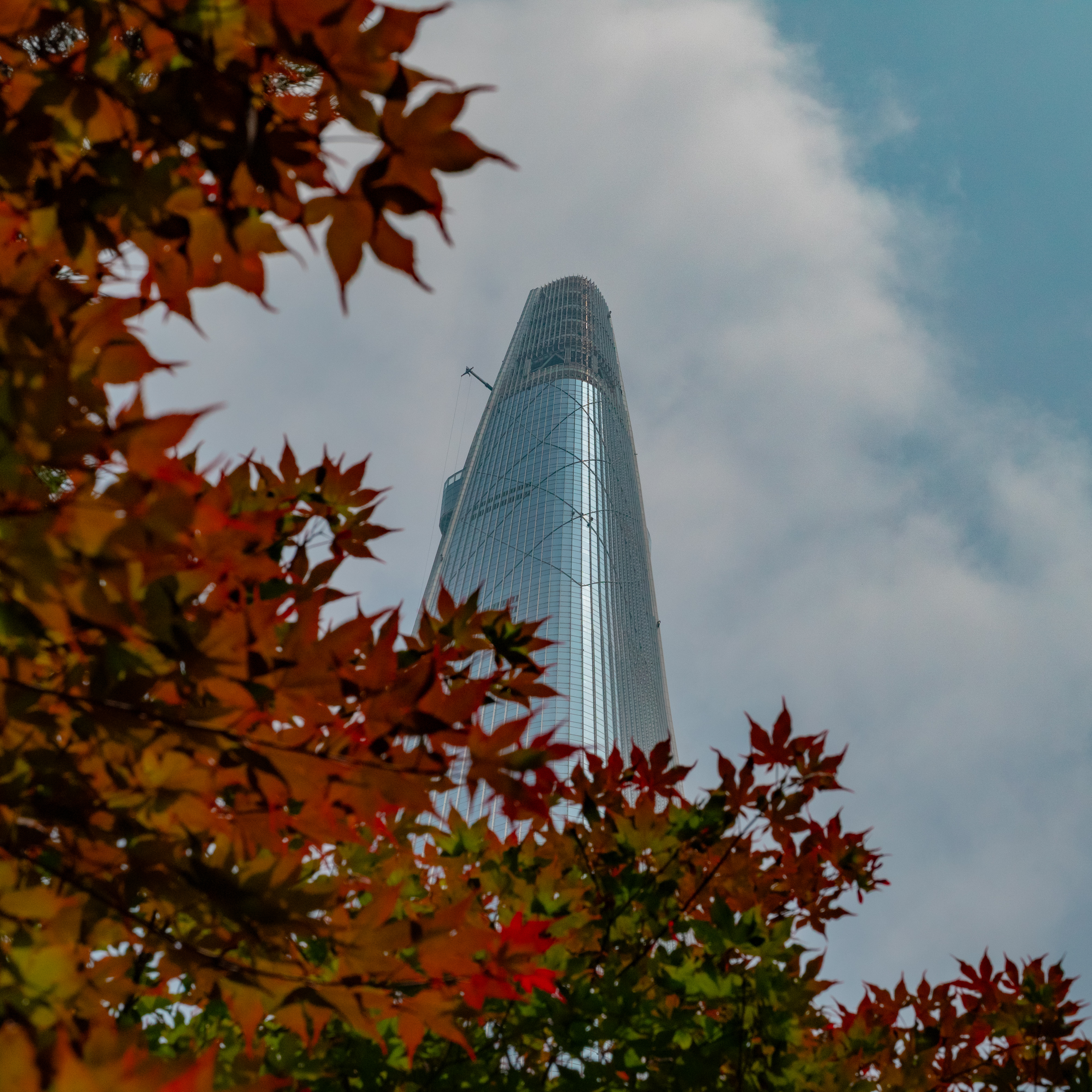 5월이라는 이른 시기에 나온 붉은 단풍잎과 대비되는 푸른 하늘과 롯데타워가 조화를 이룬다.