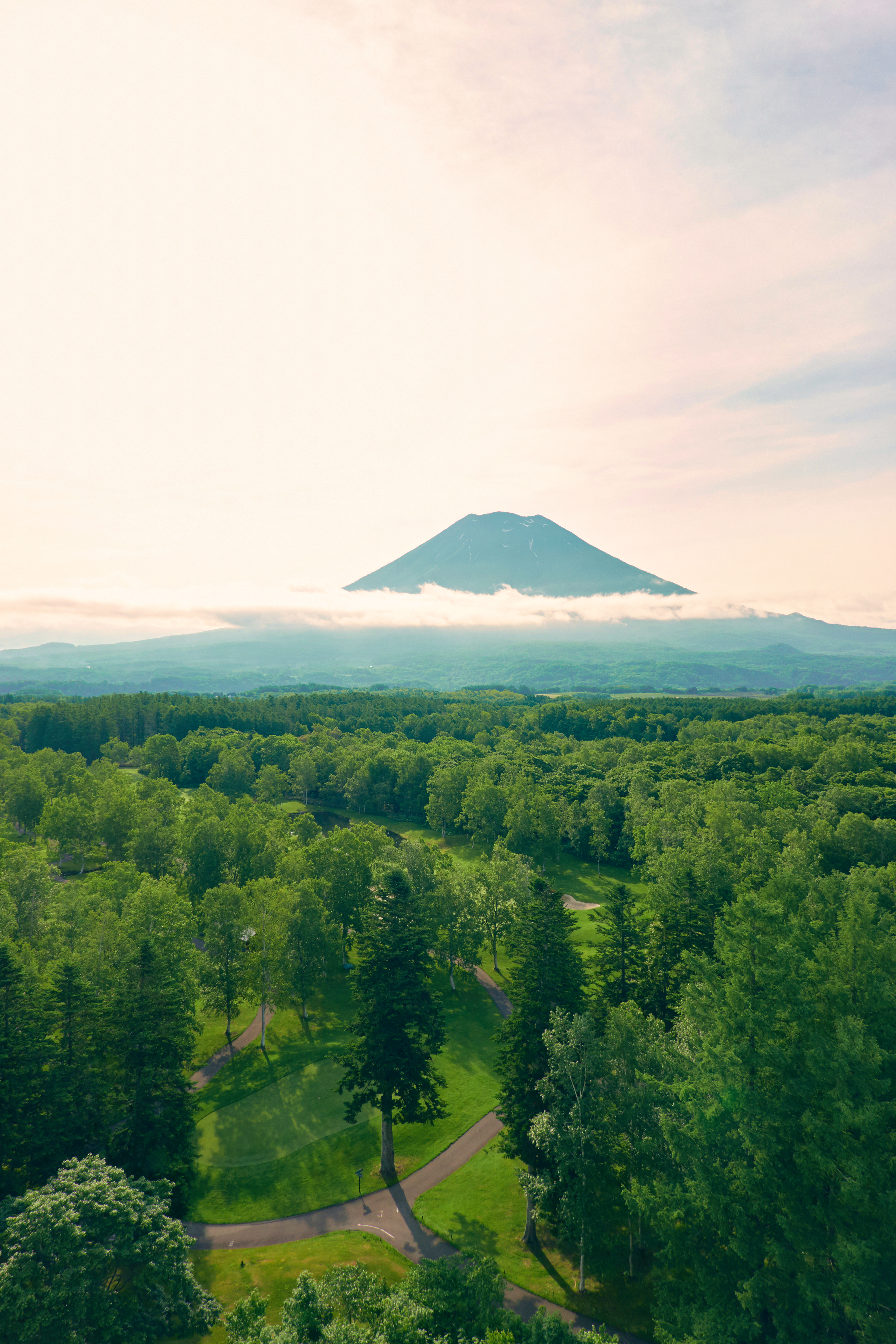 호텔에서 바라본 일본 홋카이도의 아침 풍경. 창문을 열어보니 산뜻한 아침공기가 느껴지며, 한적한 공원 산책길을 지나 구름에 둘러싸인 요테이산이 한눈에 보인다.