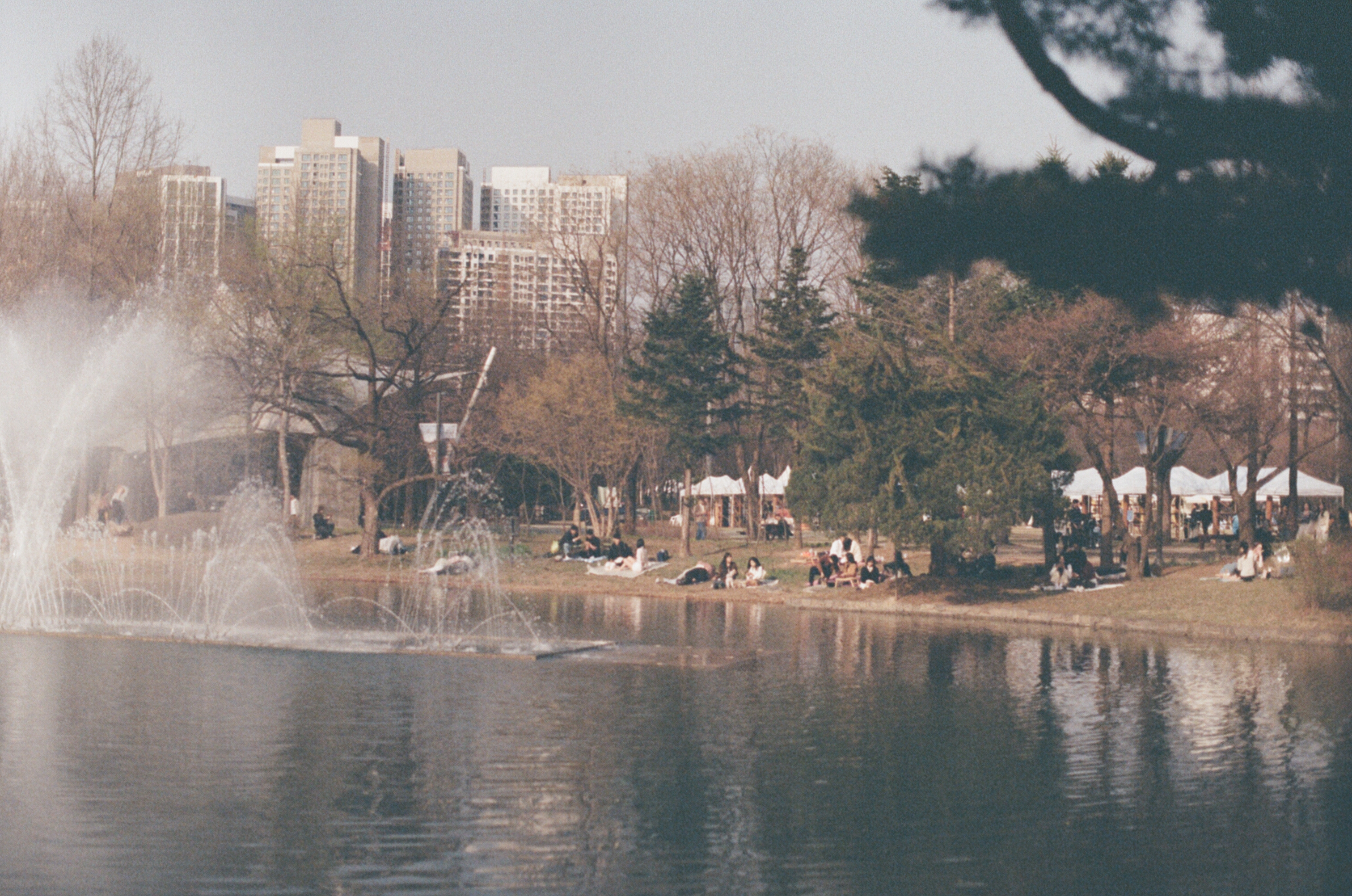 분수와 돗자리를 피고 앉은 사람들이 봄을 즐기는 거 같았습니다
