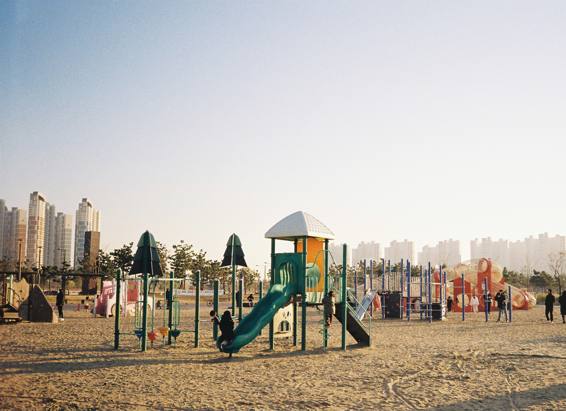 놀이터에서 노는 것이 일상 속 하나인 아이들의 웃음에 행복한 어른이 담은 모습