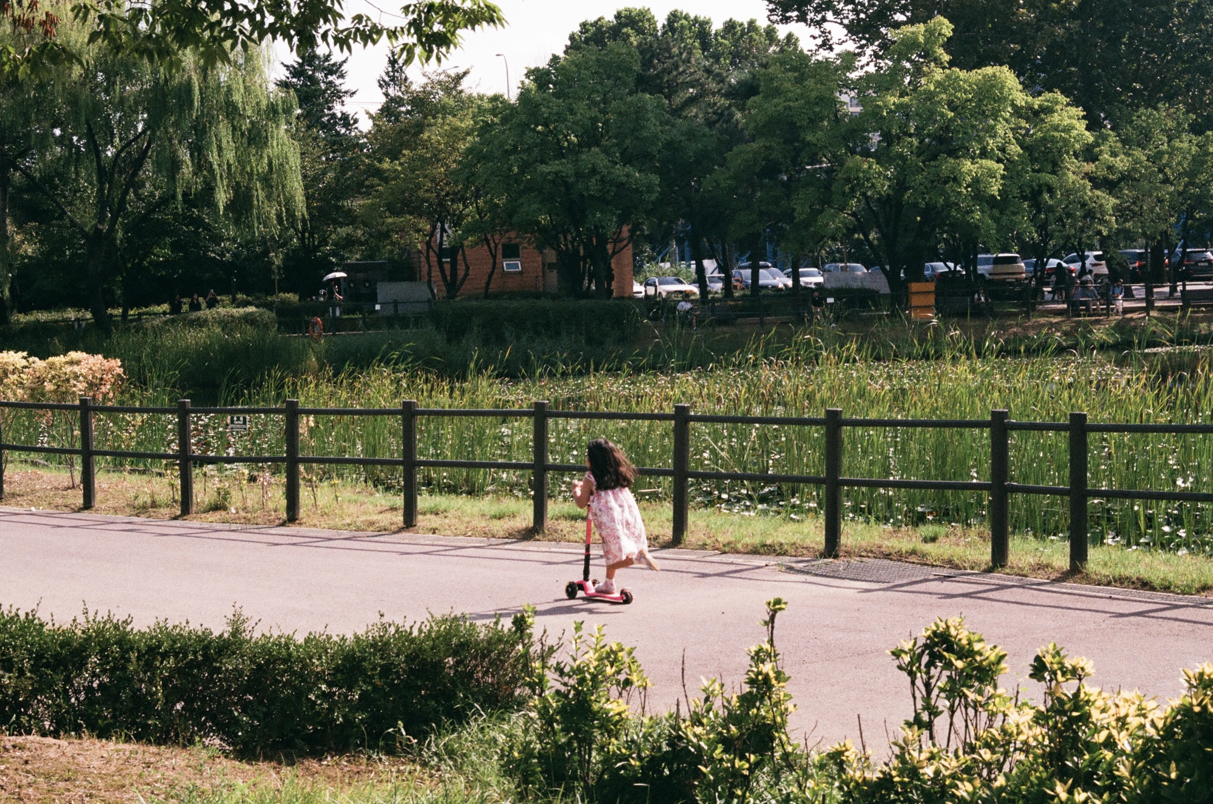 푸른 여름, 용산가족공원에서 신나게 킥보드 타는 소녀를 담았습니다. 초록의 싱그러움과 어린아이의 자유로움이 함께 담겨 보기만 해도 기분 좋아지는 사진이에요! 필름카메라 LEICA R-E 필름 Fuji100