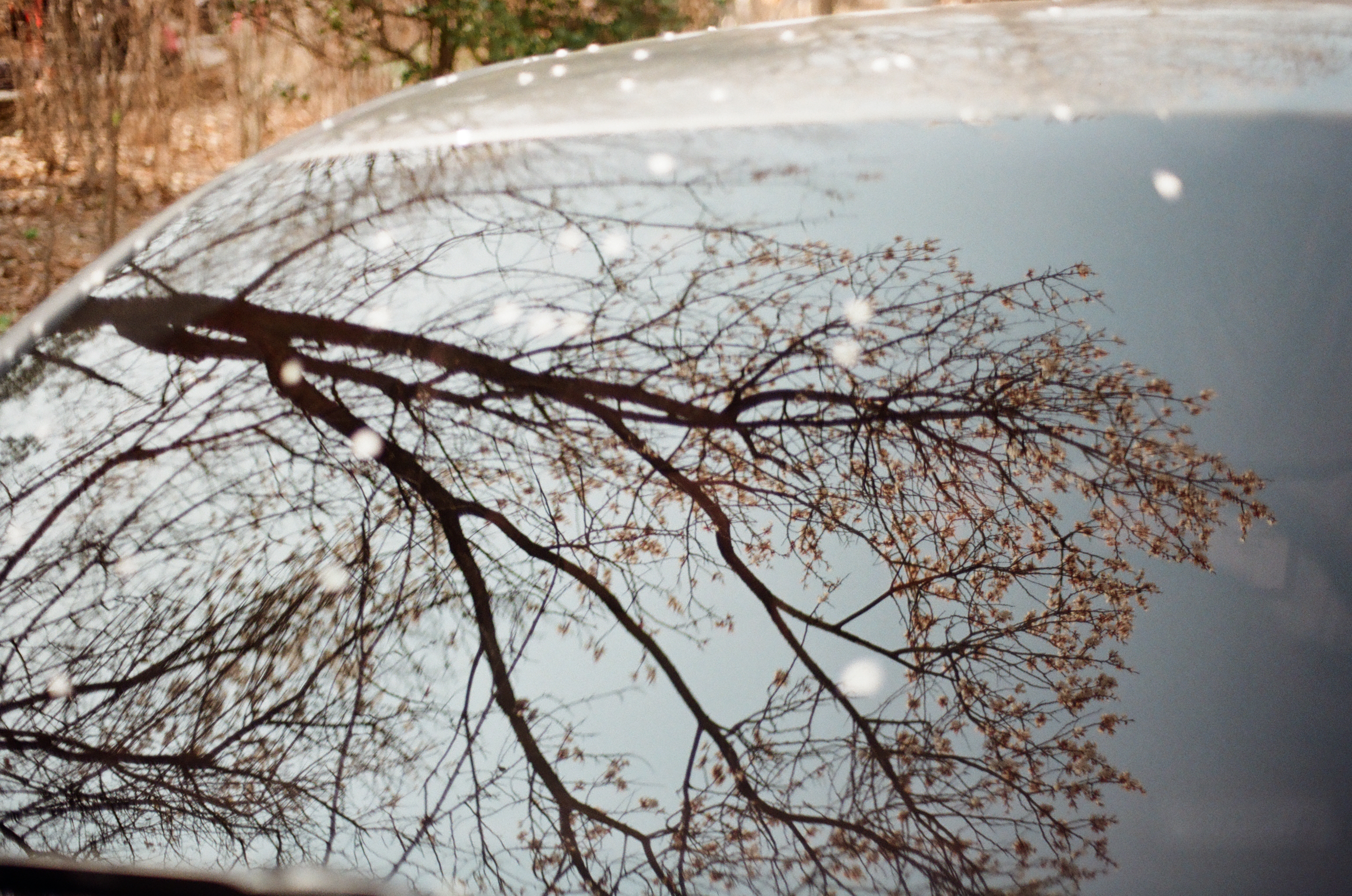 떨어지는 벚꽃잎과 자동차 유리에 반사된 벚꽃나무를 함께 담아봤습니다.