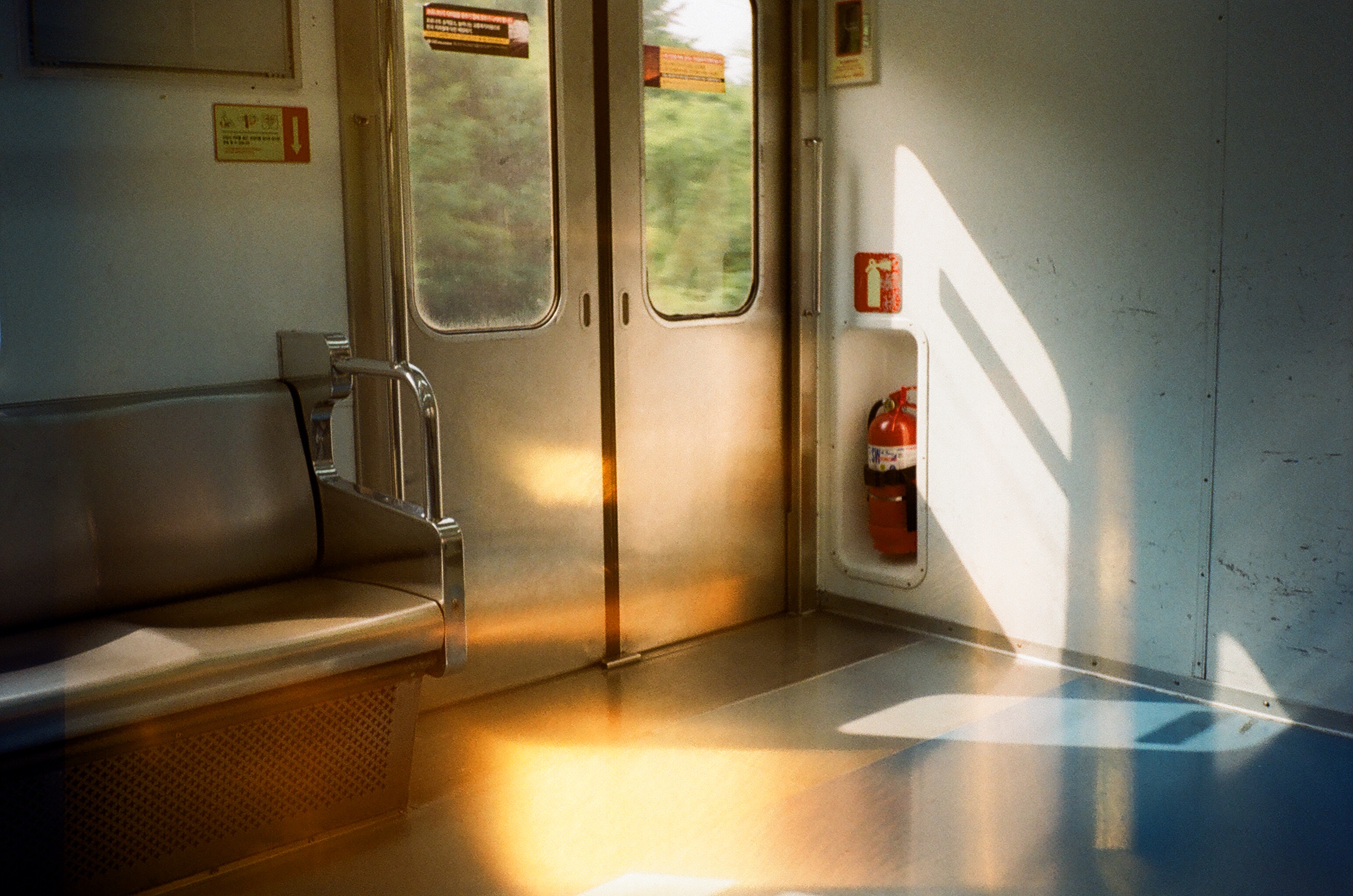 이런저런 일들로 지쳐 휴식이 필요해 떠난 오이도 여행 날 지하철 끝 칸에 앉아 꾸벅꾸벅 졸다 눈을 뜨니 사람들은 아무도 없고 공허 했던 마음을 따뜻한 빛 줄기가 들어와 그림자가 만들어지는 모습을 보고 위로를 받음 그 후 사진을 스캔 하여 결과물을 확인 했더니 촬영 당시 카메라에 빛이 들어와 이런 결과물이 나옴