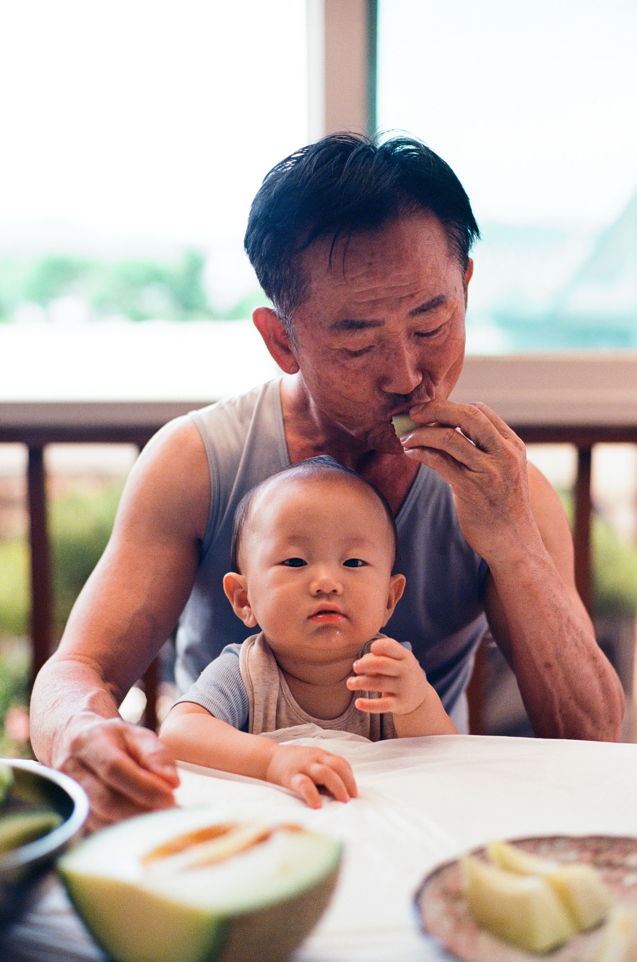 촬영자의 아버지가 촬영자의 조카를 앞에두고 멜론을 드시는 모습이 정겨워 보여서 담아보았습니다. 2024년 Leica MP Leica Summlux 35mm f1.4 4th Kodak Elgar 100