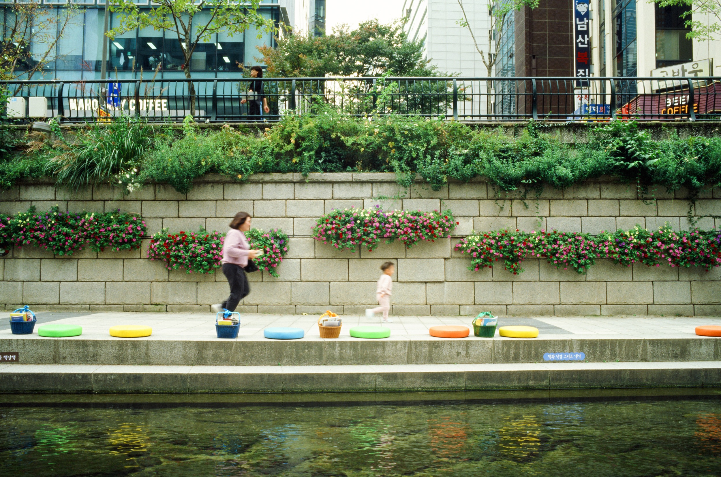 청계천에서 쉬고있을 때 건너편에 뛰어가는 아이와 아이를 잡으려는 엄마의 모습을 담아봤습니다. 2024년 Leica MP Leica 35mm f1.4 summilux 4th Kodak E100