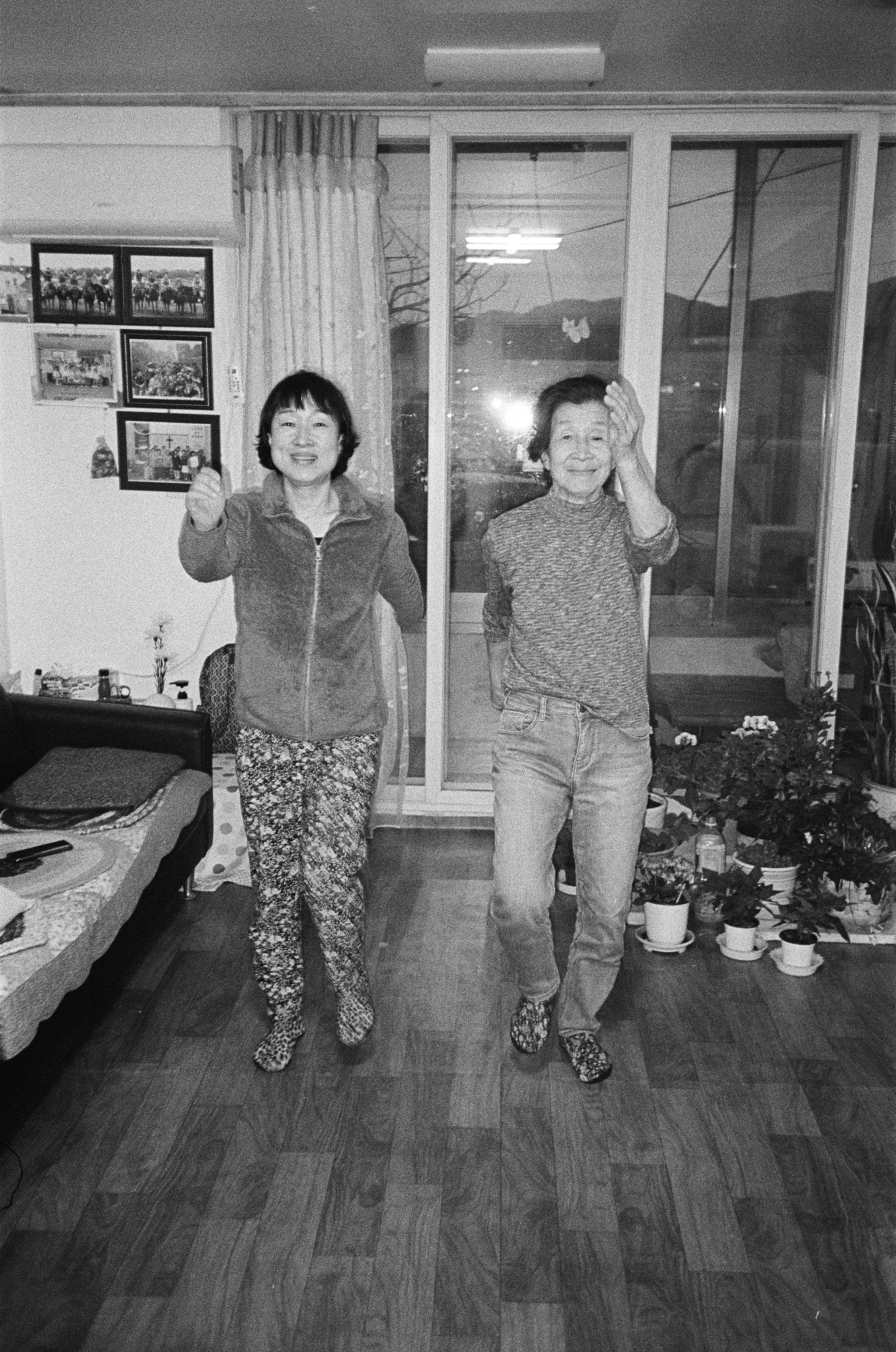 엄마와 외할머니가 실내운동 중인 장면입니다.