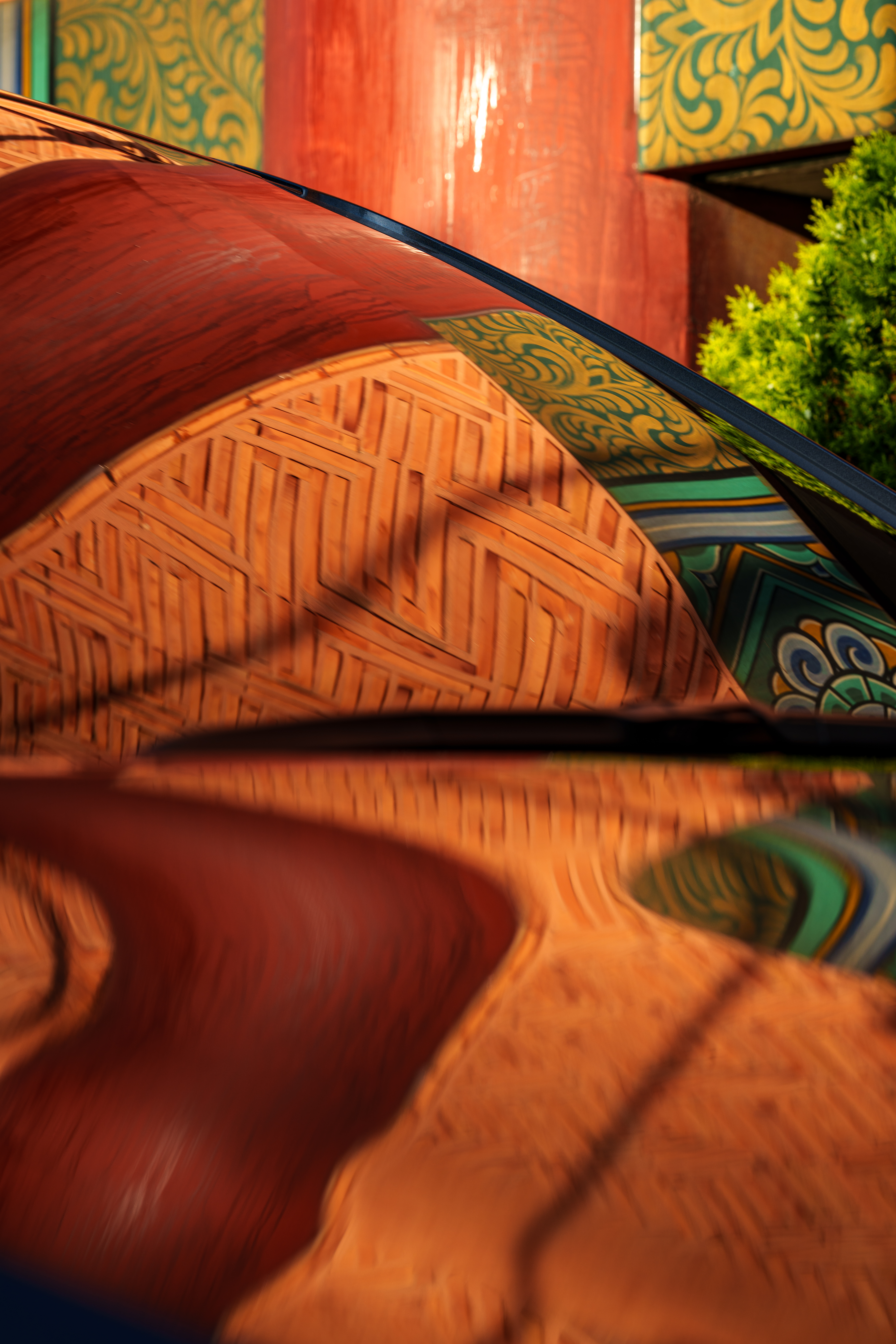 인천 차이나타운 어느 골목에 추차된 차량에 반영된 중국풍 외벽의 모습입니다.
