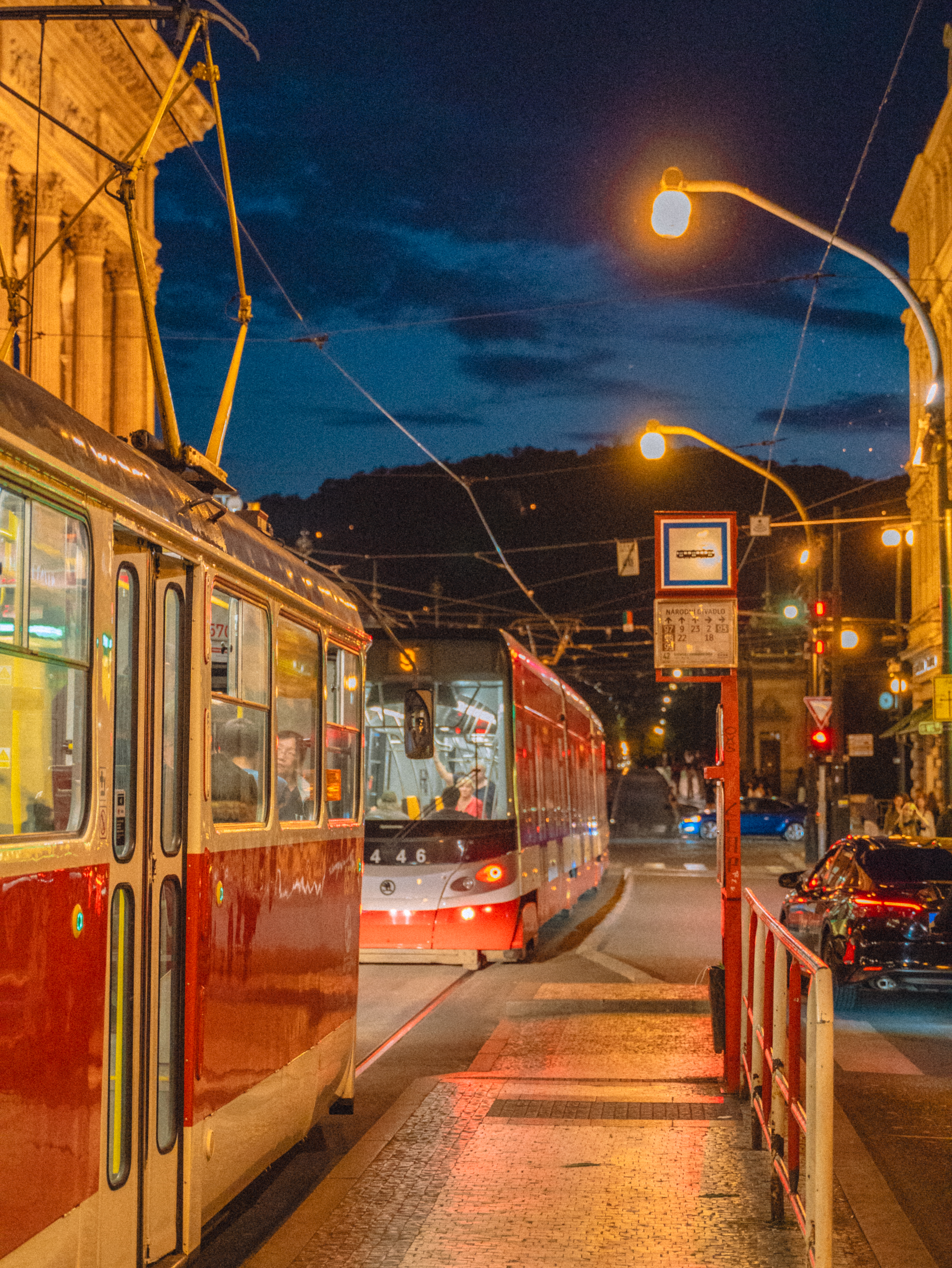 프라하 야경 속 낭만을 타고 집으로 돌아가는 사람들