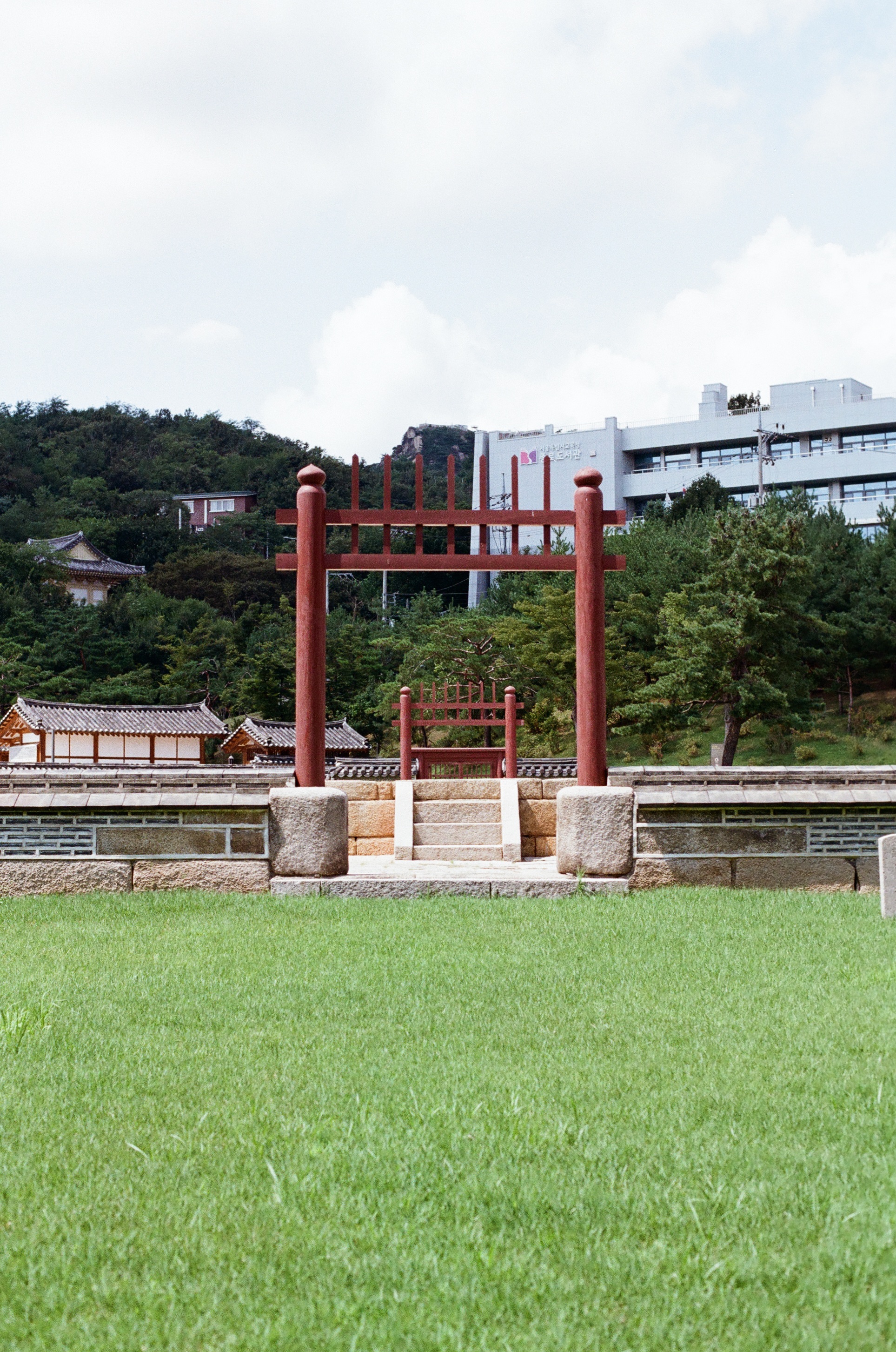 서촌에 사직단에서 찍은 풍경사진입니다. 온도는 높지만 계절이 바뀌려는 듯 높아지는 하늘에 사직단의 목조 구조가 펼쳐진 풍경입니다.