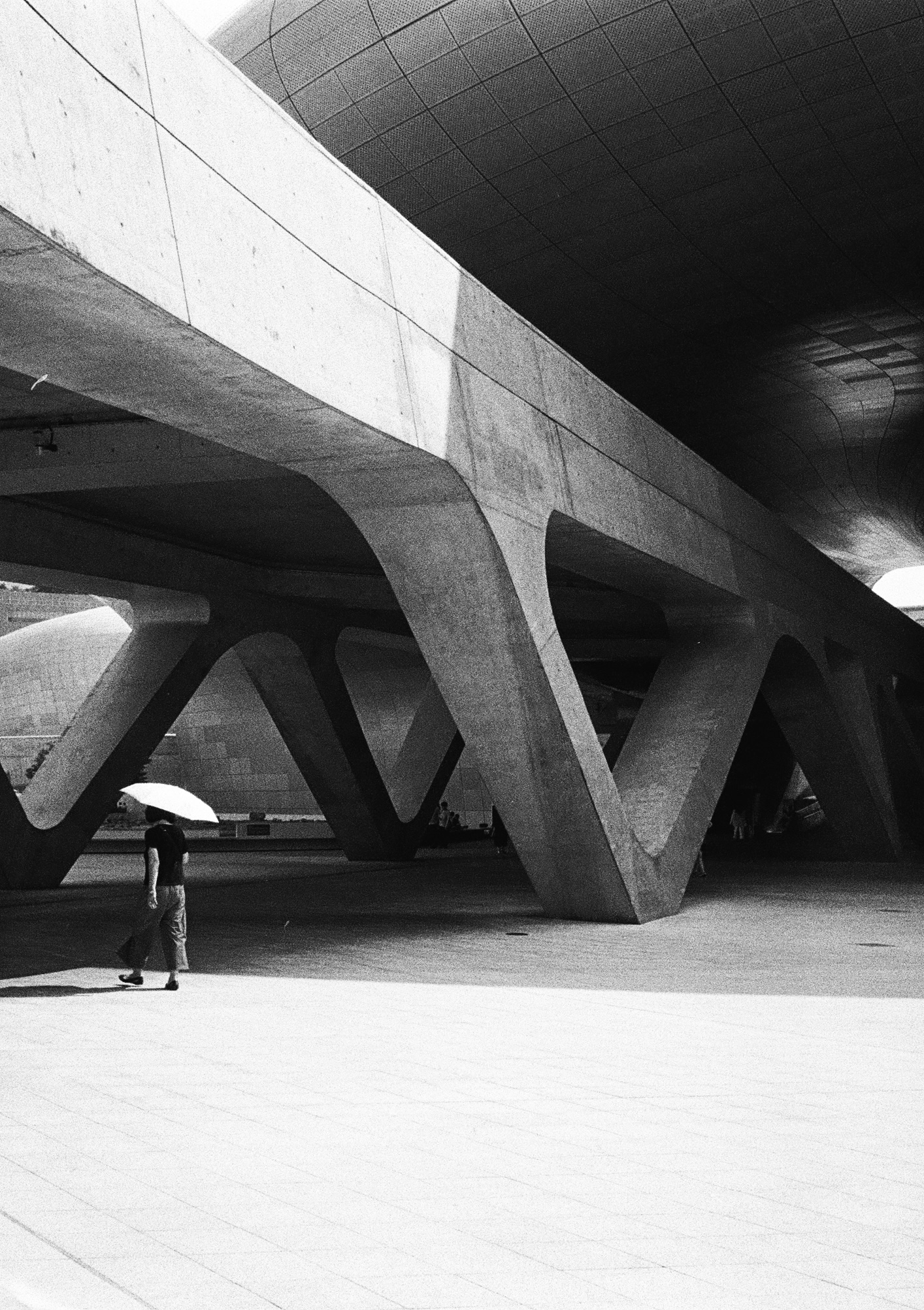 뜨거운 여름 햇볕아래 태양이 없는곳으로 피신중인 양산 쓴 사람들