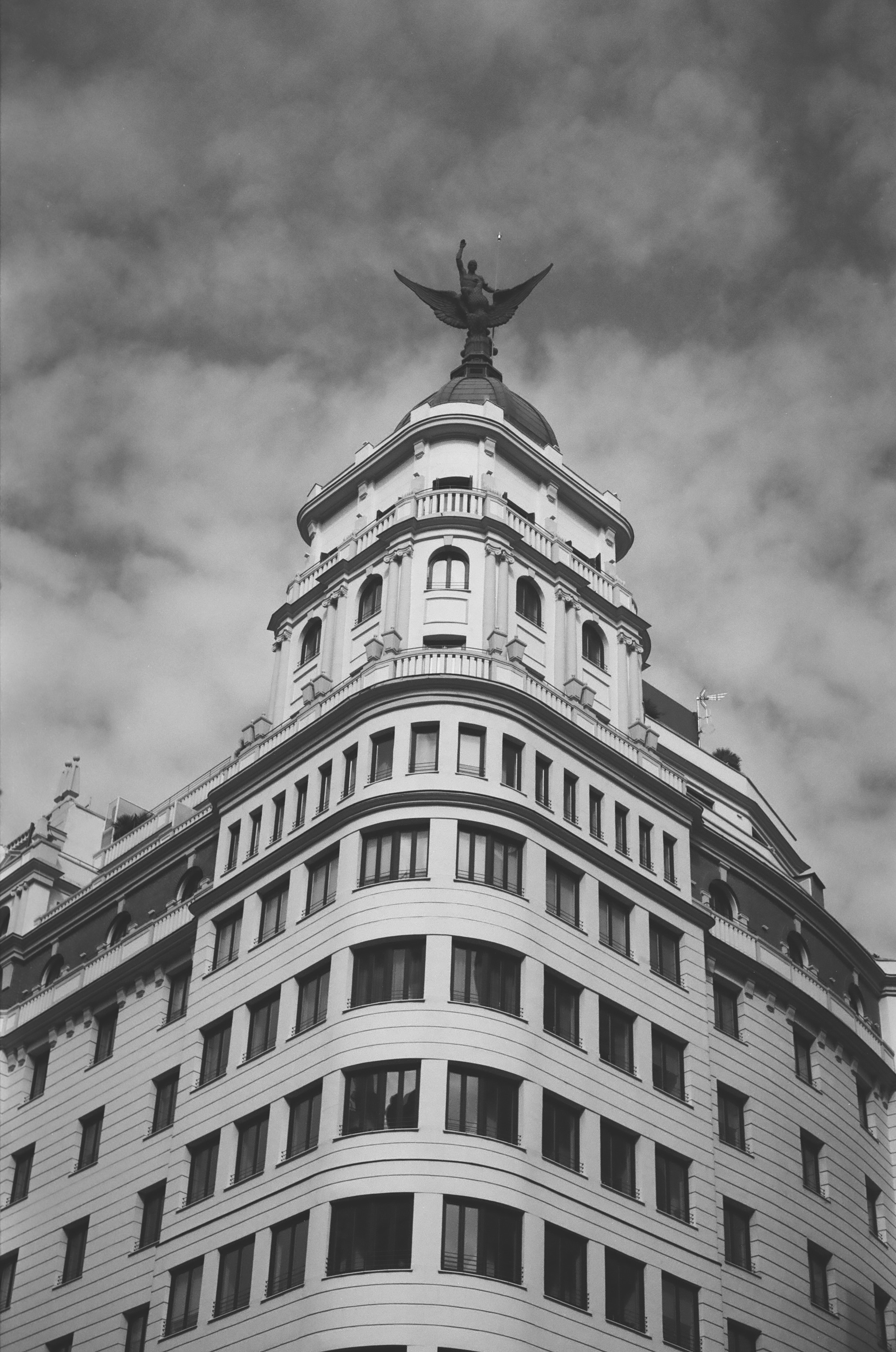 회색 하늘 아래, 건물 위의 조각상이 묵묵히 도시와 시간을 지켜본다.