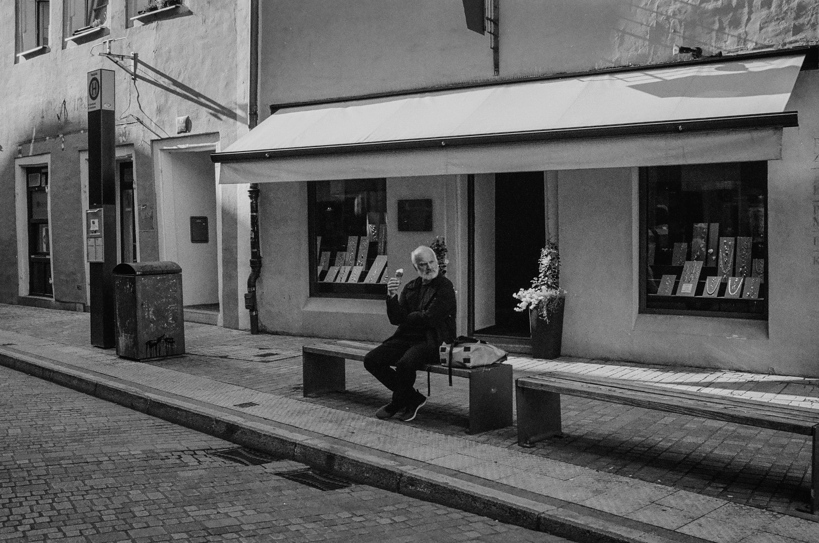 지난주 독일 레겐스부르크에 갔을때 찍은 사진입니다. 오후.6시쯤 이어서.그림자가 길게 드리울때여서 라이카 mp에 미리 들어가 남아있던 컬러필름을 소진시키고 일포드 400 HP5로 감아 찍던차에 혼자 벤치에 앉아 아이스크림을 먹으며 쉬고있던 노신사분을 발견하고 찍었습니다. 해가 직접 인물을 비추는 상황은 아니었지만 상점의 벽과 차양이 흰색이어서 골든아워때 흑백필름의 특성을 잘발휘해주었고.비록 그늘아래였지만 일포드400의 훌륭한 감도 성능으로 인물의 성격도 잘 드러낼수있었던것 같습니다