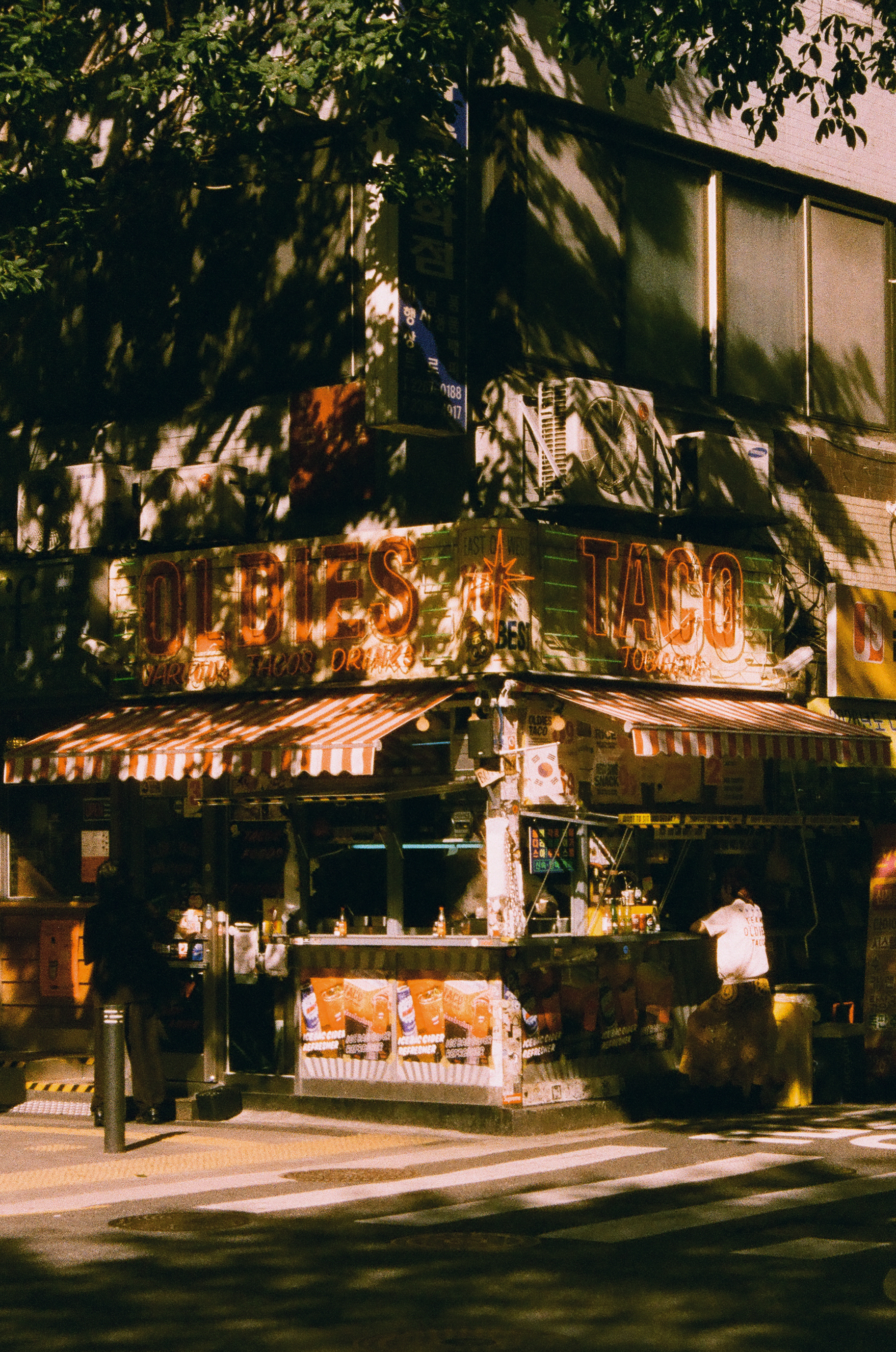 을지로의 거리에서 간판과 나무 그림자가 뒤섞인 도심 속 작은 가게의 풍경을 담았다.Yashica fx-3 super 2000 + ML Zoom 35-70mm f/3.5-4.8HARMAN PHOENIX II 200