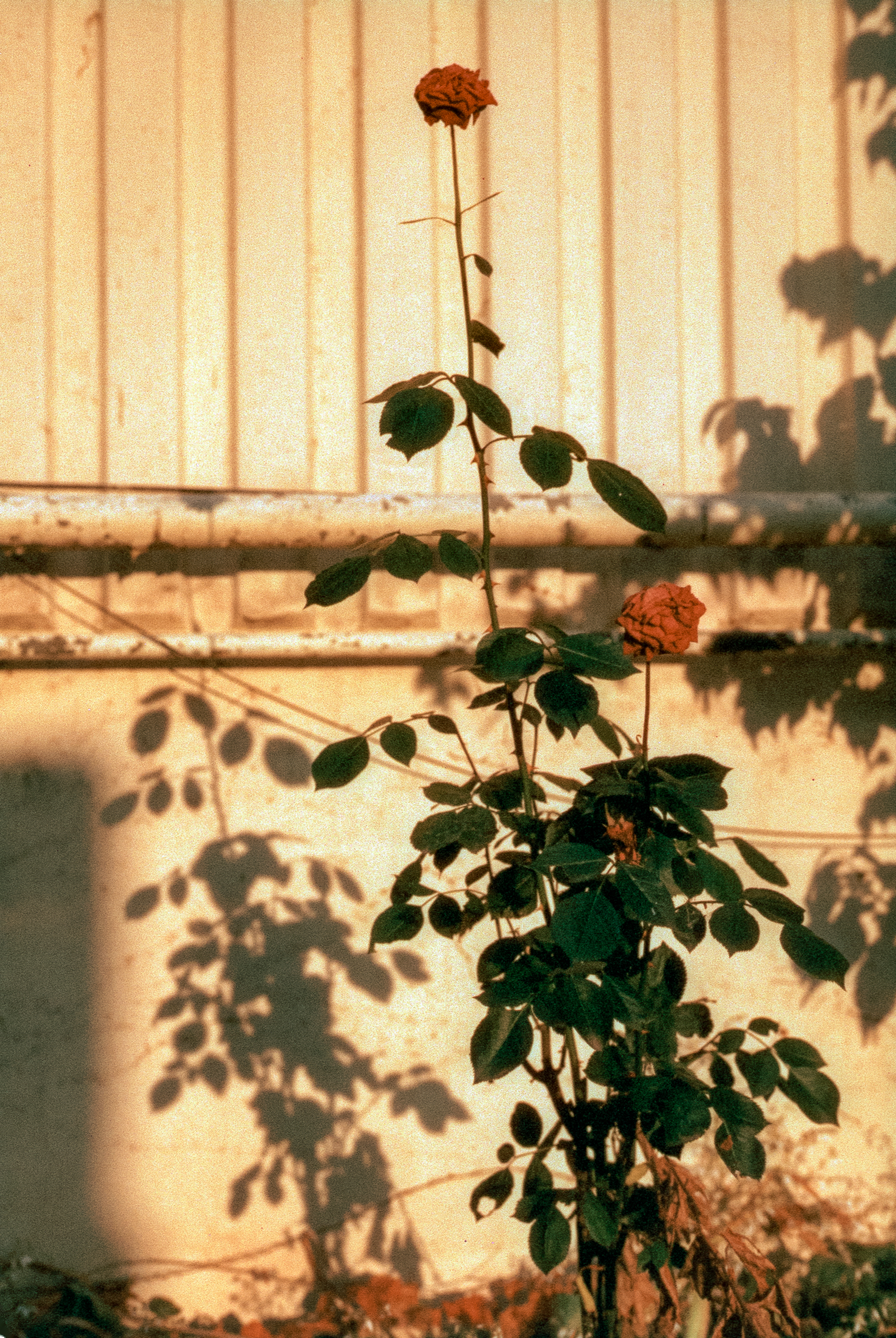 해질녘, 강렬한 석양과 장미와 그림자.