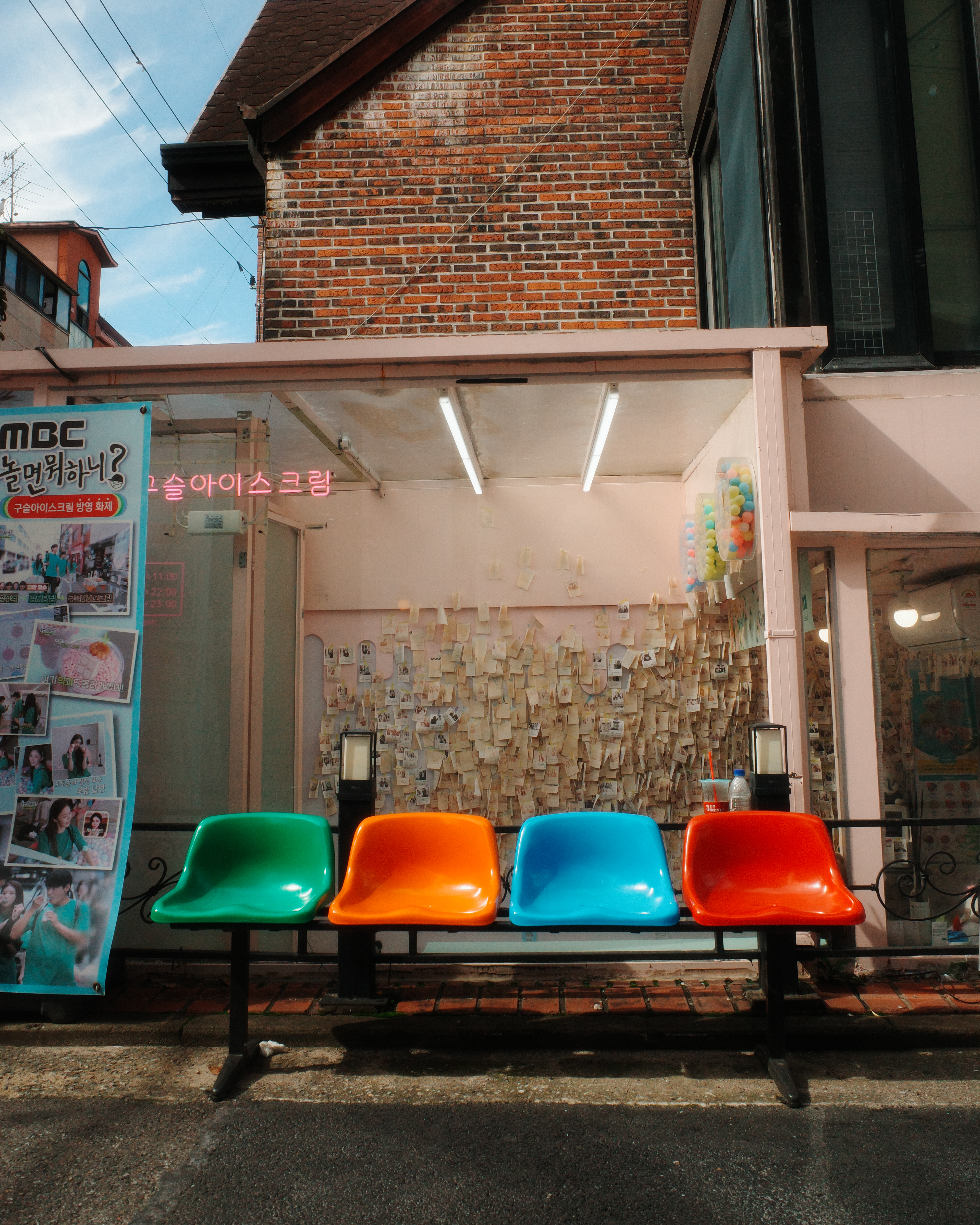 홍대 골목 걷다가 우연히 마주친 의자들인데요, 색이 너무 팝하게 눈에 꽂혔어요. 주변은 다 평범한데 의자 네 개만 딱, 그림처럼 놓여있더라구요. 햇빛까지 예쁘게 비쳐서 그냥 지나치기 아까워서 바로 찍었어요. 괜히 그 자리에 잠깐 앉아보고 싶었어요.