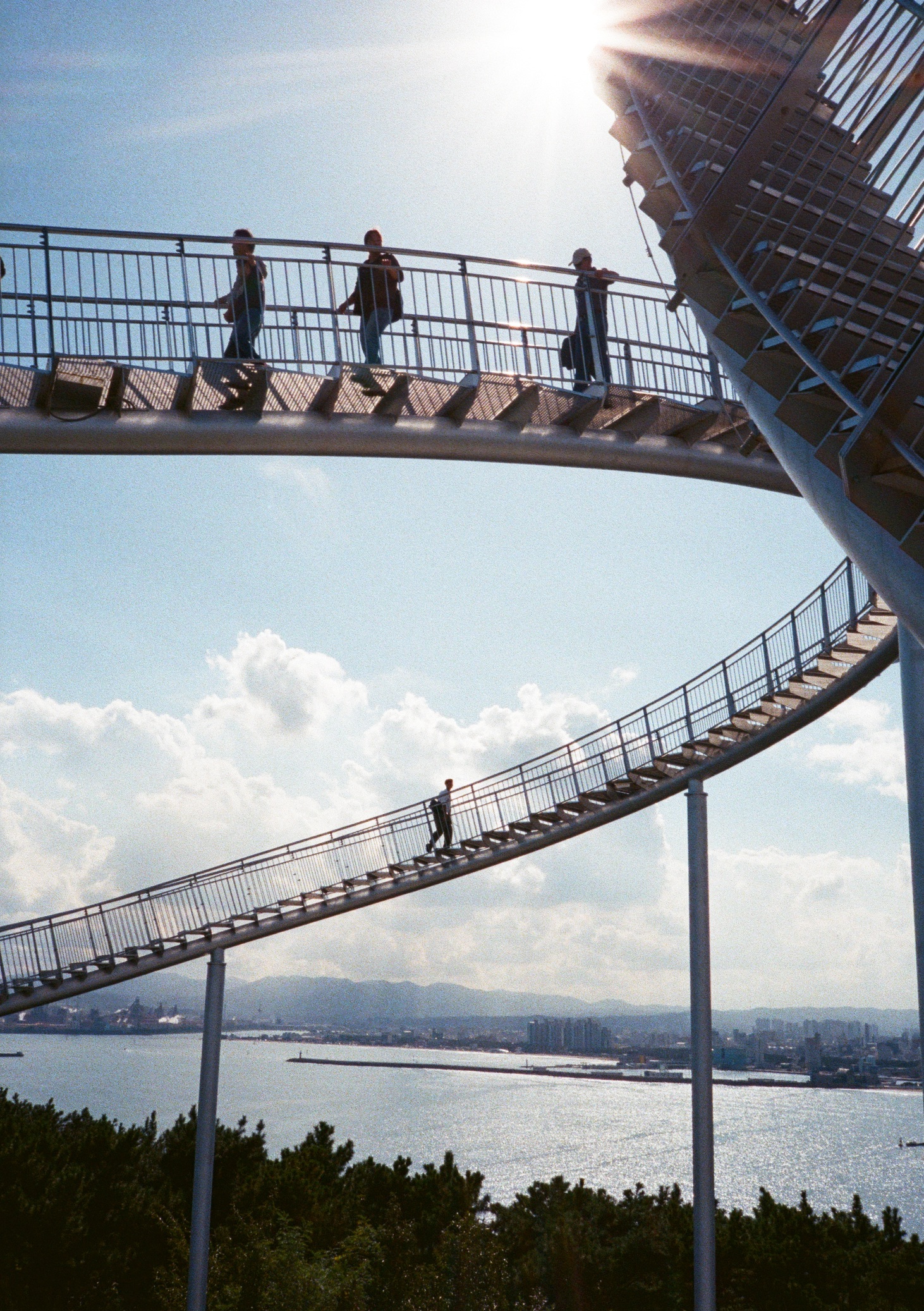 맑고 푸른 하늘과 윤슬이 반짝이는 바다를 배경으로 계단을 오르내리는 사람들의 윤곽이 보인다.