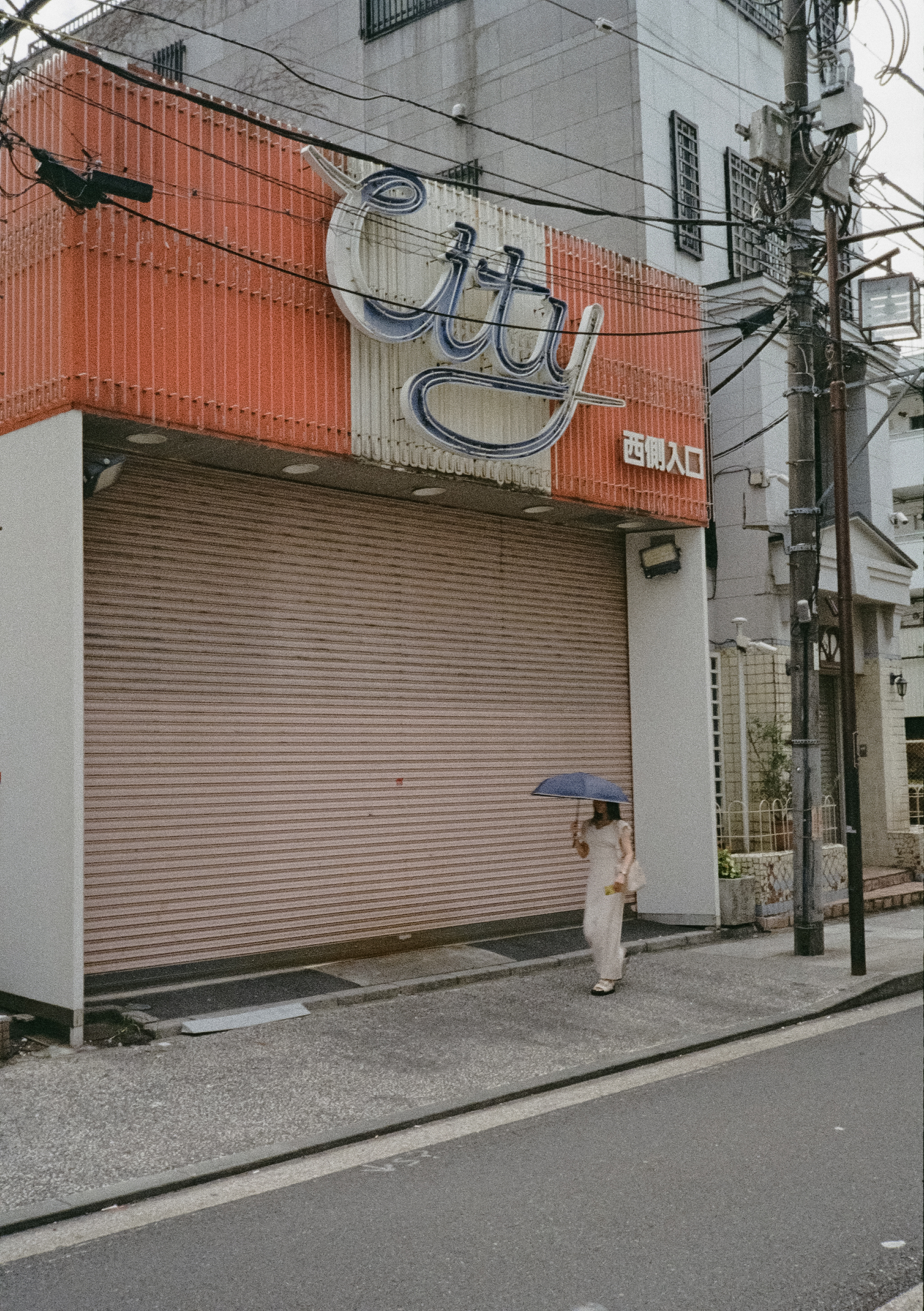 한국사람에게도 잘 일려진 명곡 <블루라이트 요코하마>의 배경, 후쿠토미초. 밤이면 밤마다 네온 불빛으로 번쩍이는 이 거리가, 낮에는 거짓말처럼 깊은 잠에 빠져든다. 여름의 온도에 멈춰버린 이 거리에, 양산을 쓴 얼굴 없는 여인이 단 한 줄의 선율처럼 스쳐 지나갔다. Pentax 17 | P모드 | 코닥 컬러플러스