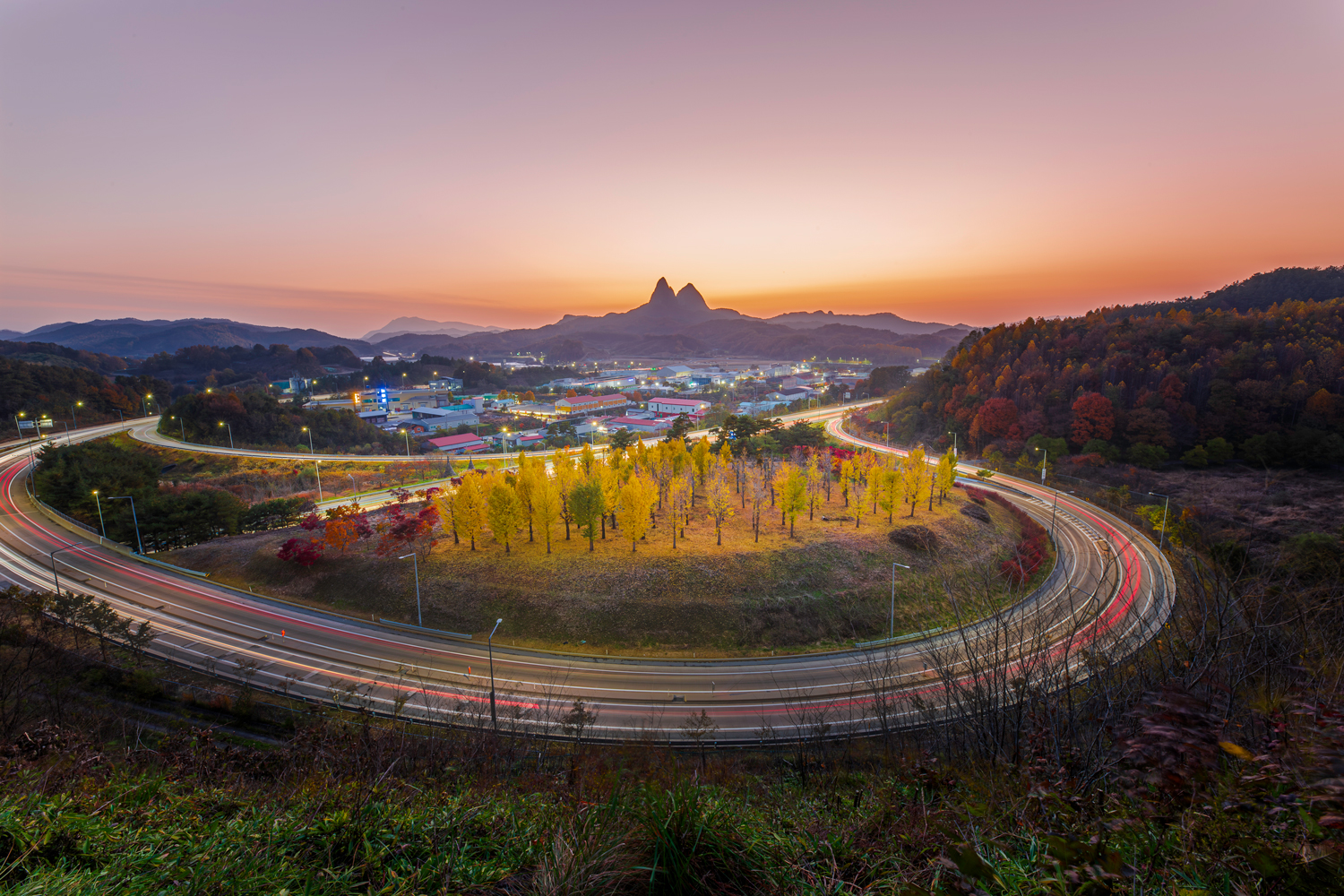 마이산이 보이는 언덕에서 진안IC 사이에 모여있는 은행나무의 단풍과 함께 일몰과 차량의 궤적을 담아봤습니다.