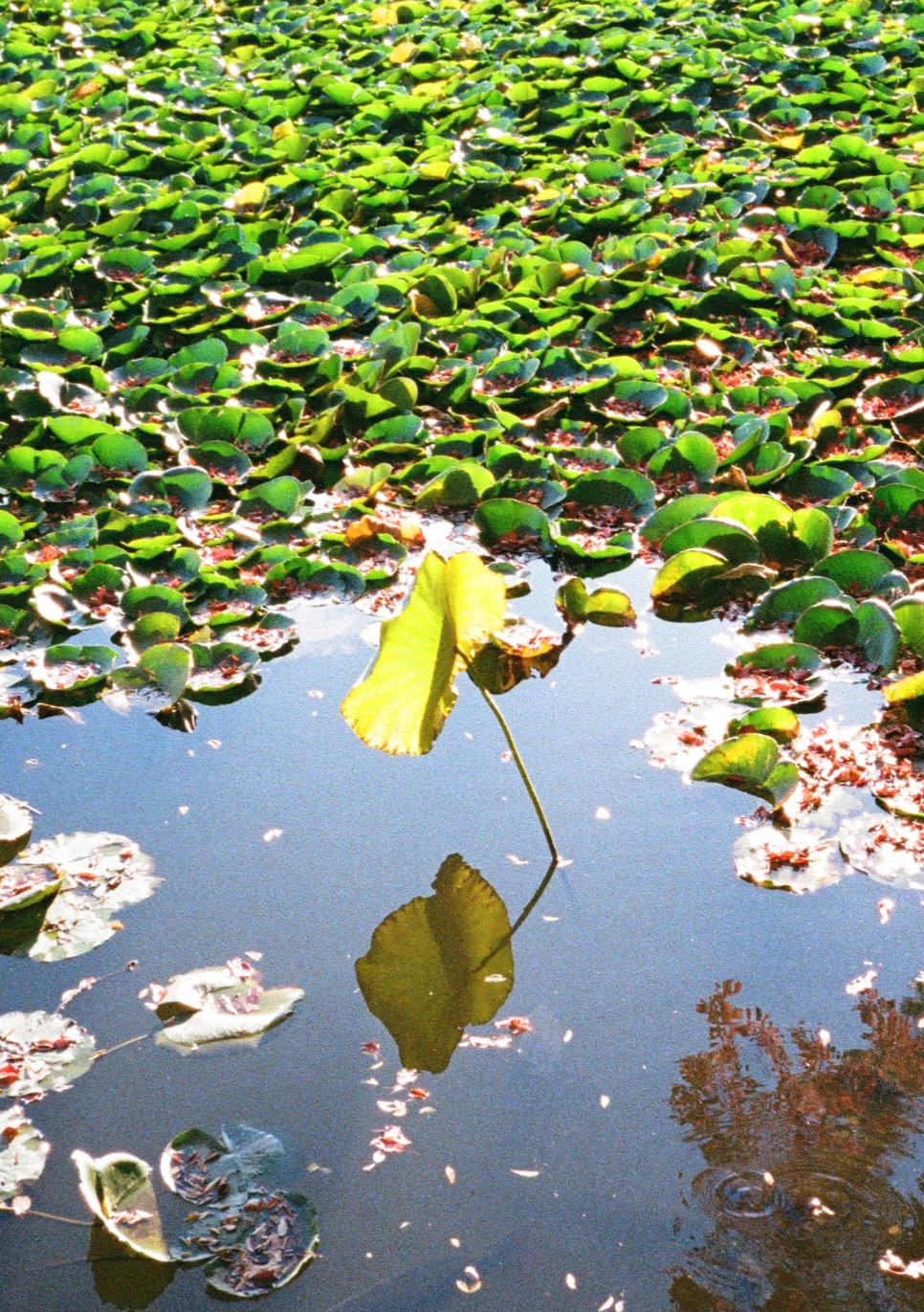 쌀쌀해질 무렵, 넓은 수면위로 빽빽하게 모여 거대한 녹색 카펫처럼 펄쳐졌던 연잎군락은 차츰 밀려나고 홀로 서있는 연잎 하나가 수면에 생긴 자신의 그림자와 이어져있다.