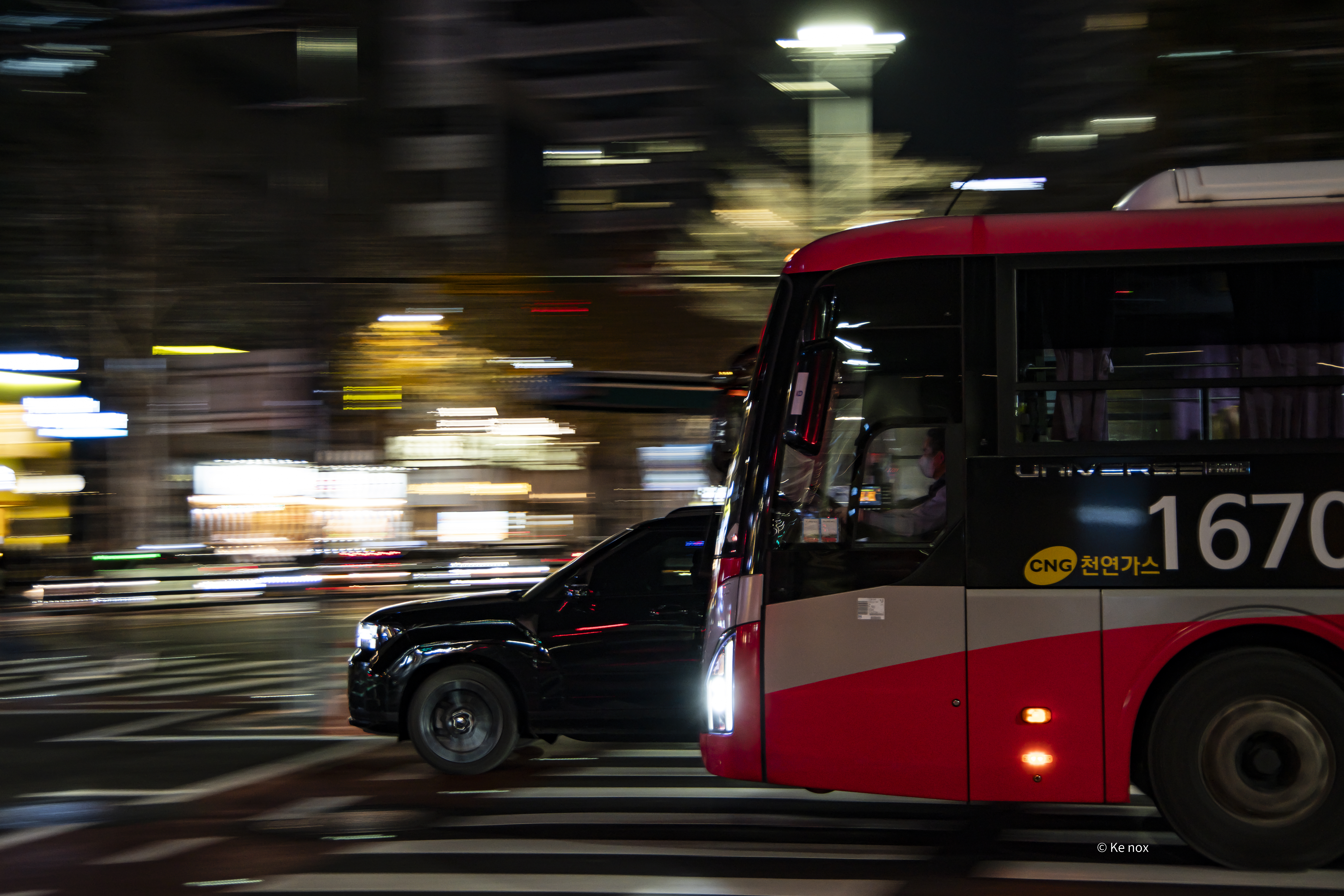 늦은 저녁 도심을 이어주는 버스를 패닝샷으로 담아냈습니다.